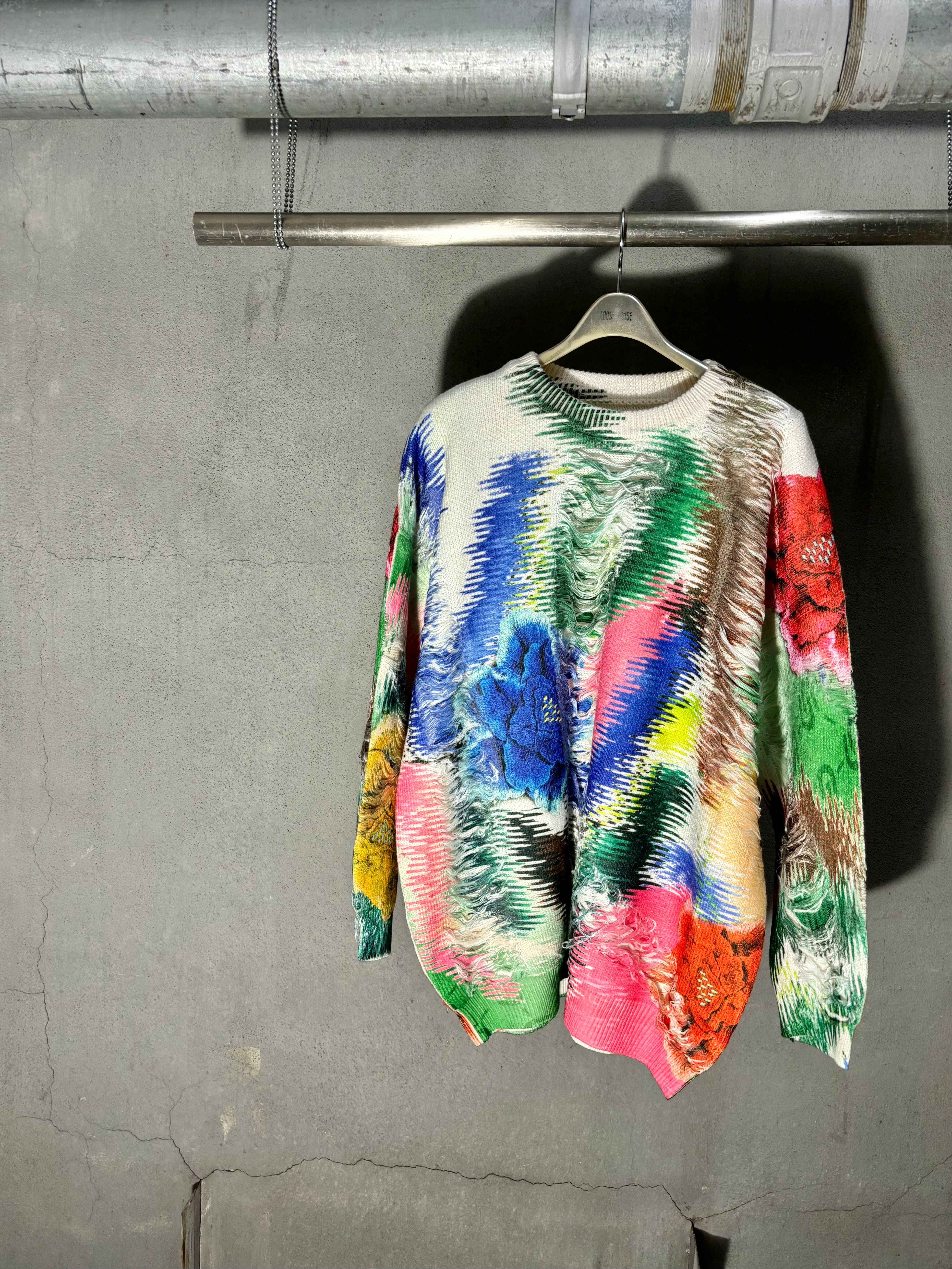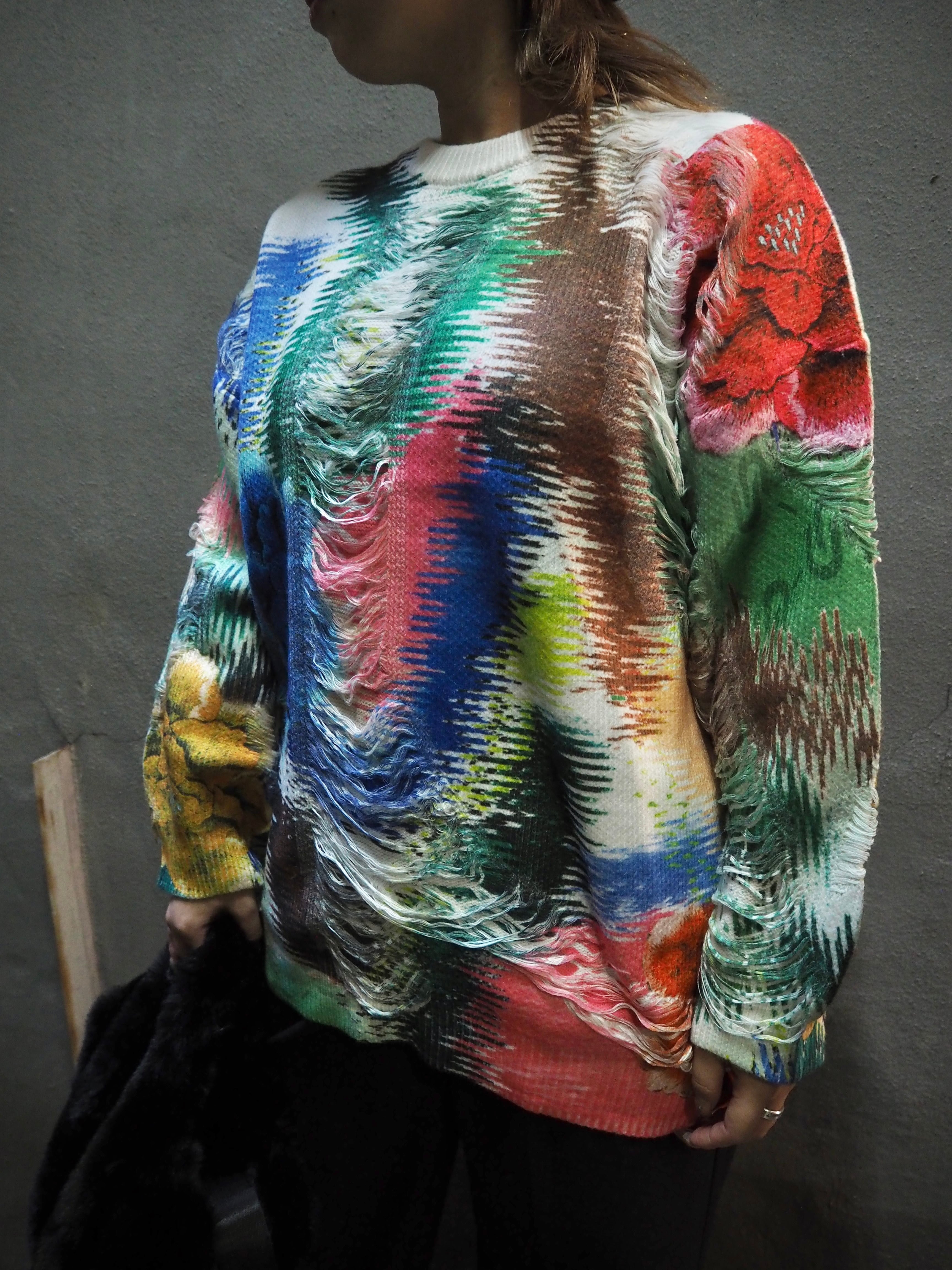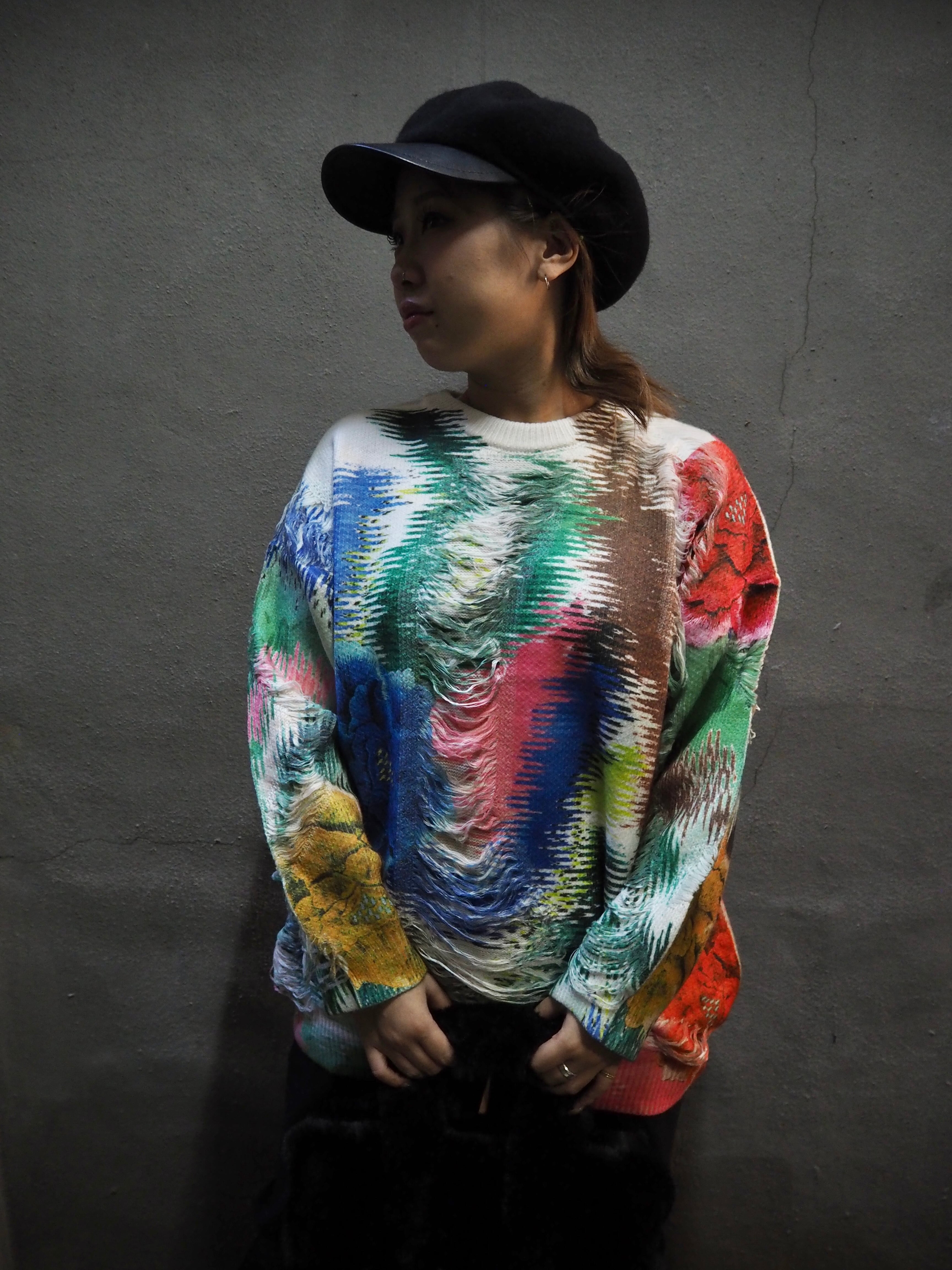 mix print × damage design knit tops トップス ニット 転写 プリント カラフル ダメージ