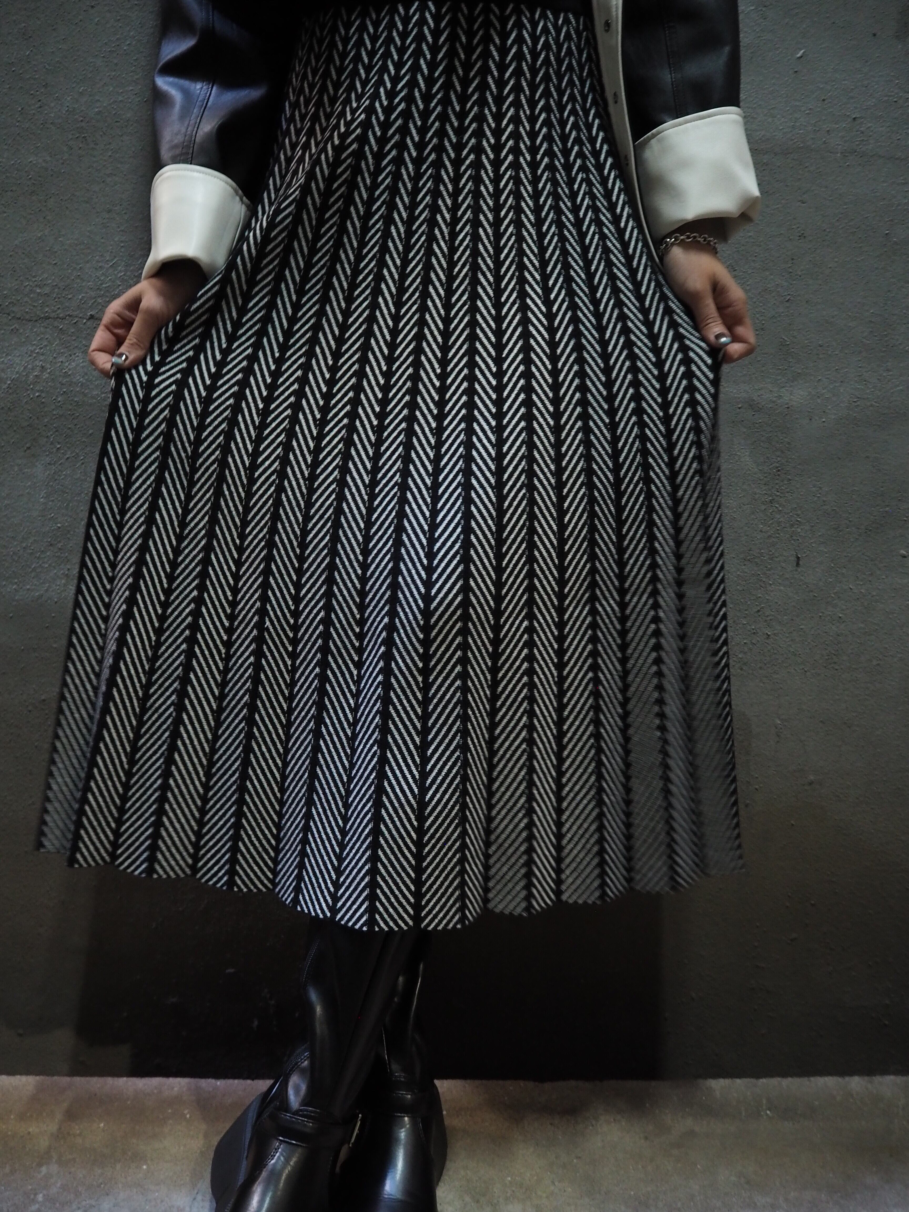 このプリーツデザインのニットスカートは、シックなモノトーン柄が特徴で、