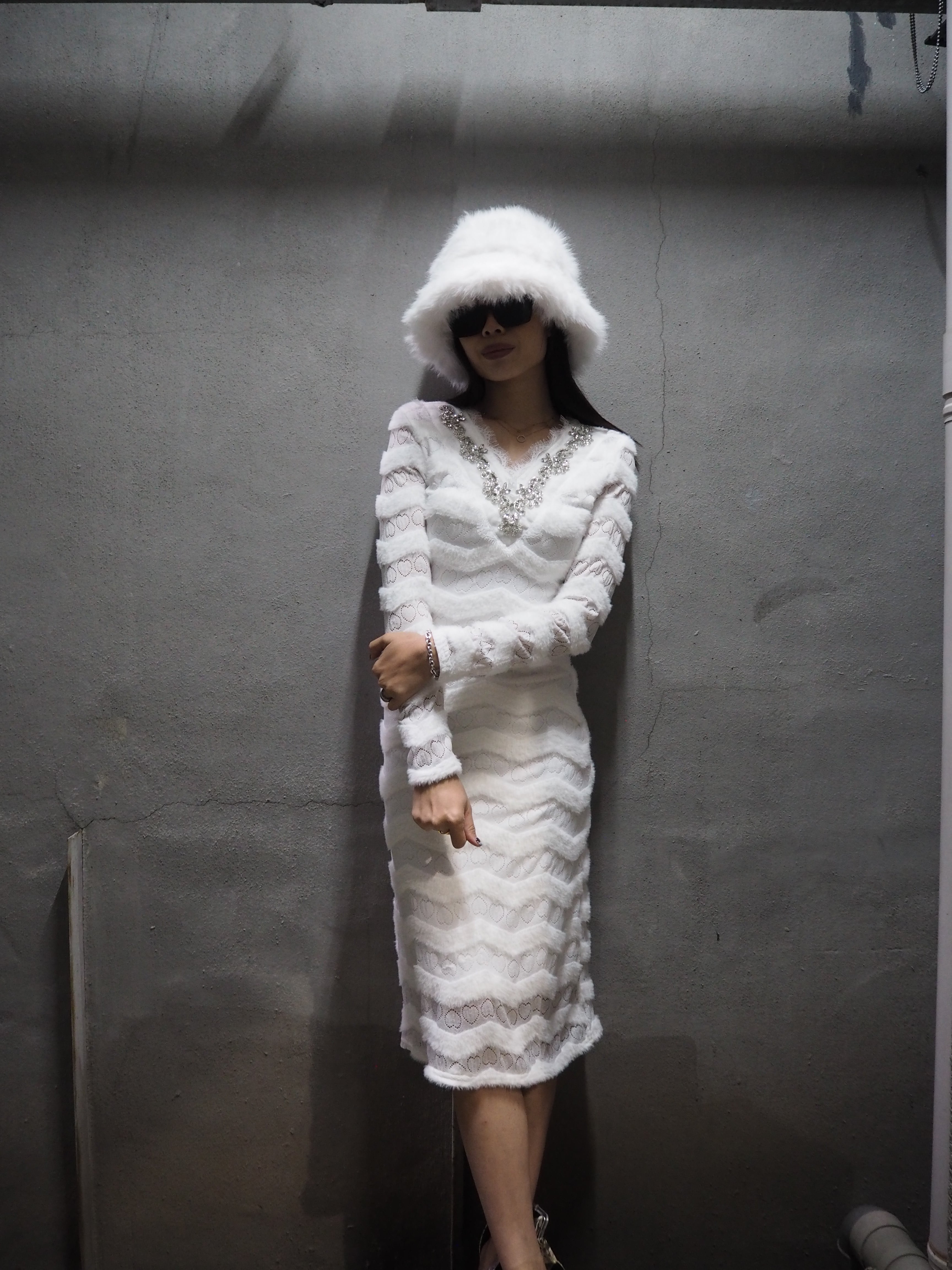 wave shaggy knit V-neck one-piece ワンピース シャギー ニット Vネック ビジュー