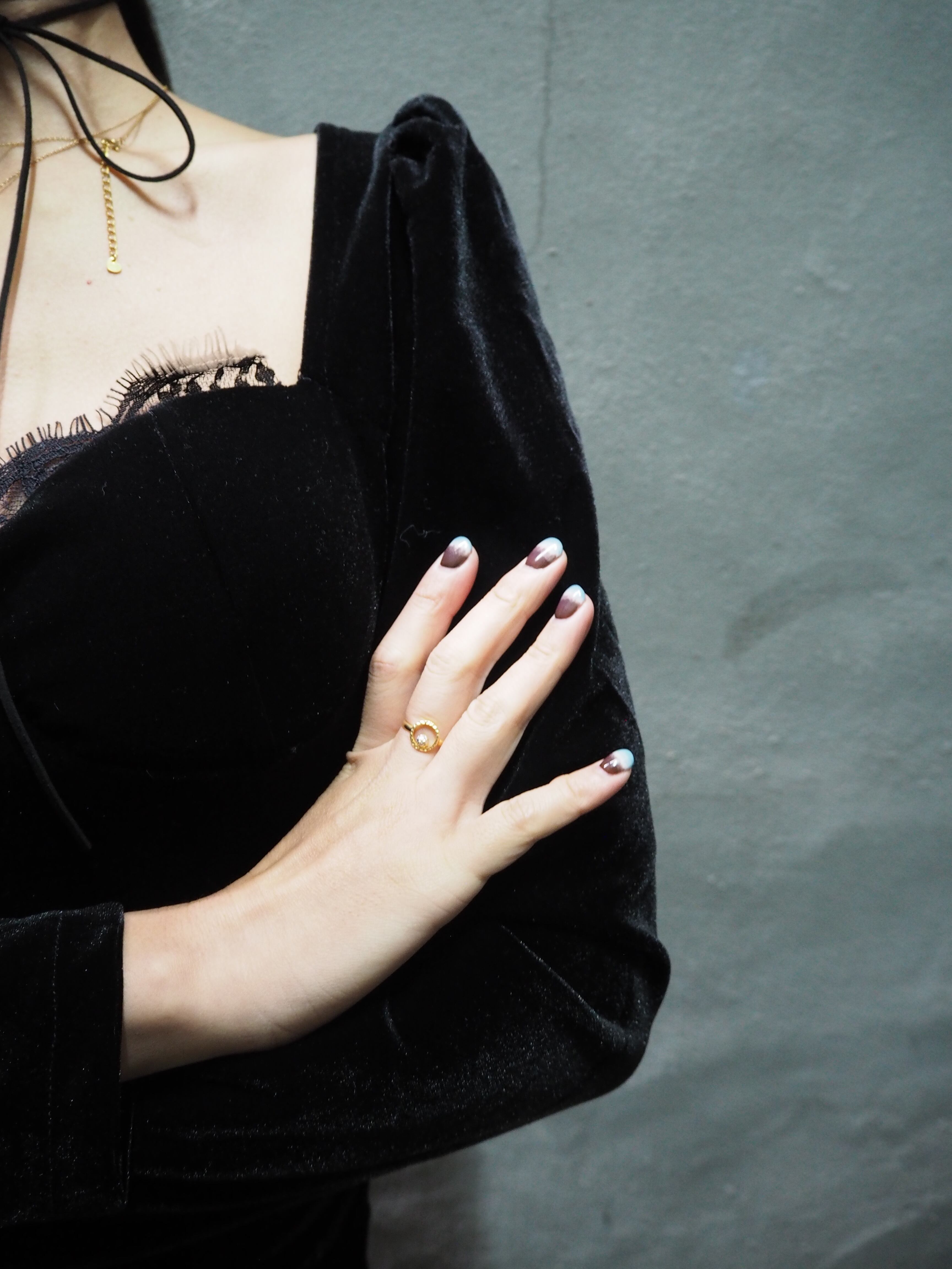 光沢感のあるブラックのベルベットが、特別な日のスタイルをグッと引き立てます。