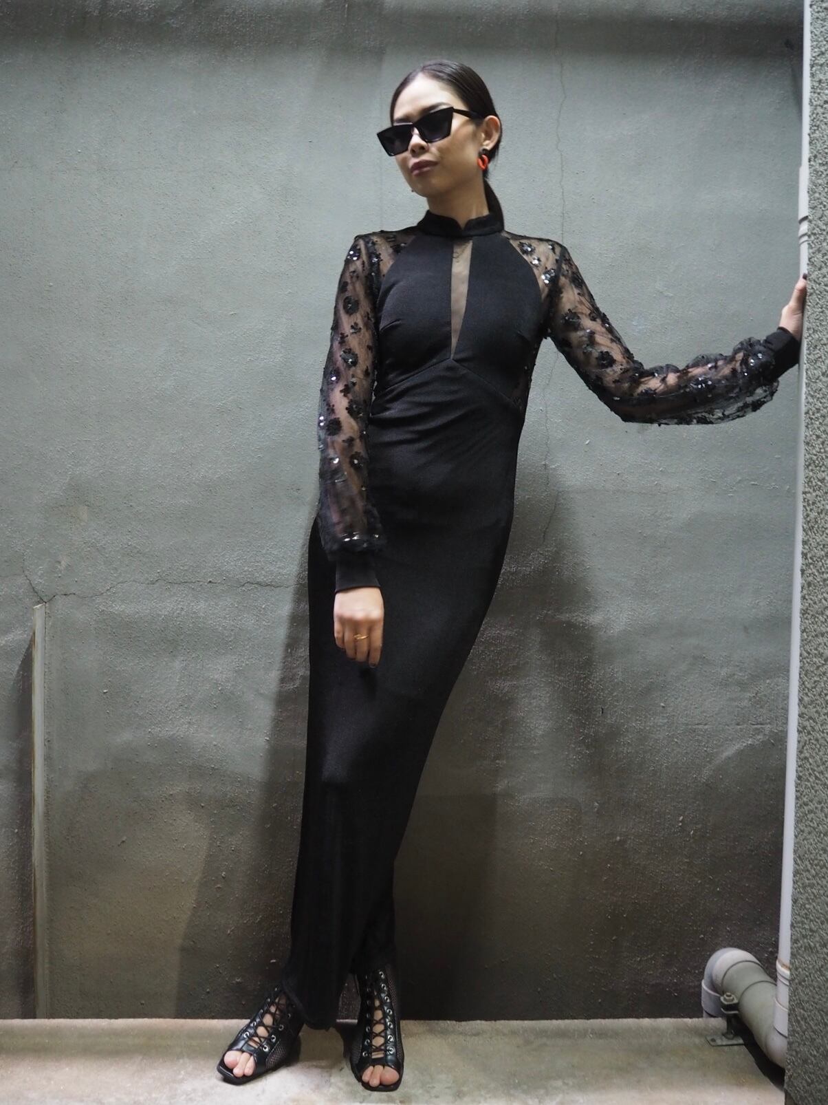 lace sleeve × velvet tight long dress ドレス ロングドレス ベルベット レース タイト 黒 ブラック パーティー