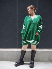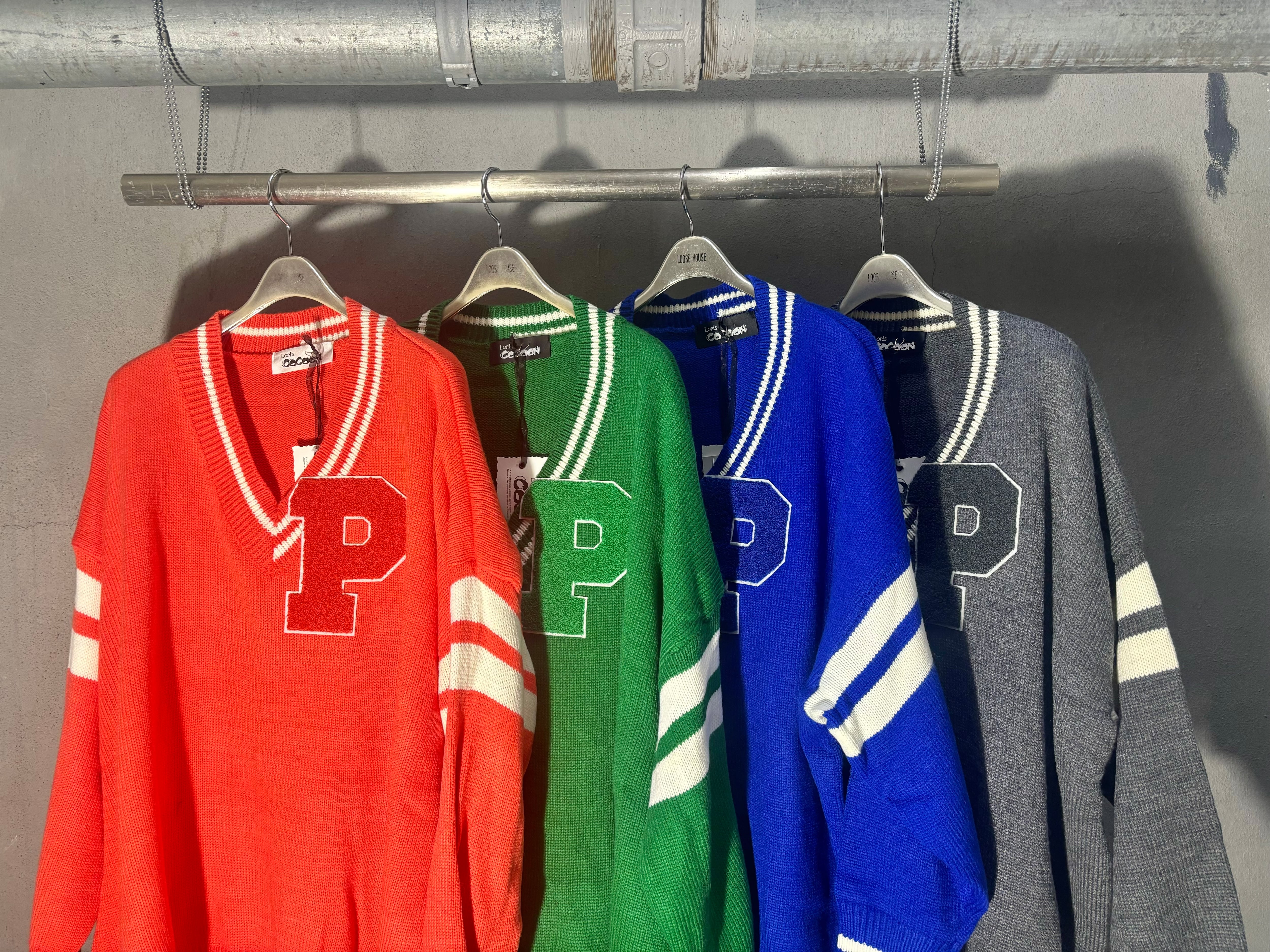 line × 〝P〟appliqué V-neck design knit ニット ニットワンピ Vネック ライン入り ゆったりめ
