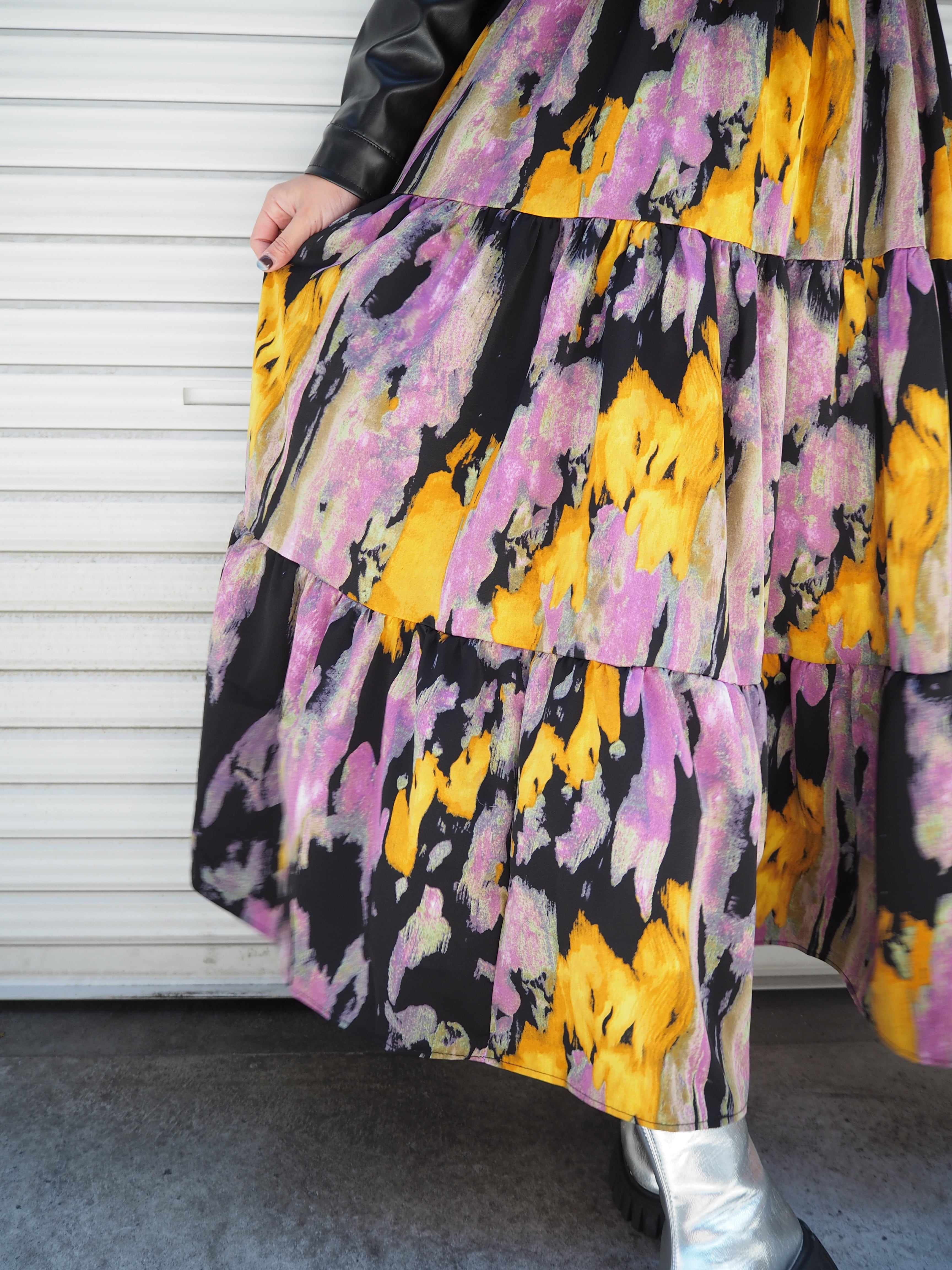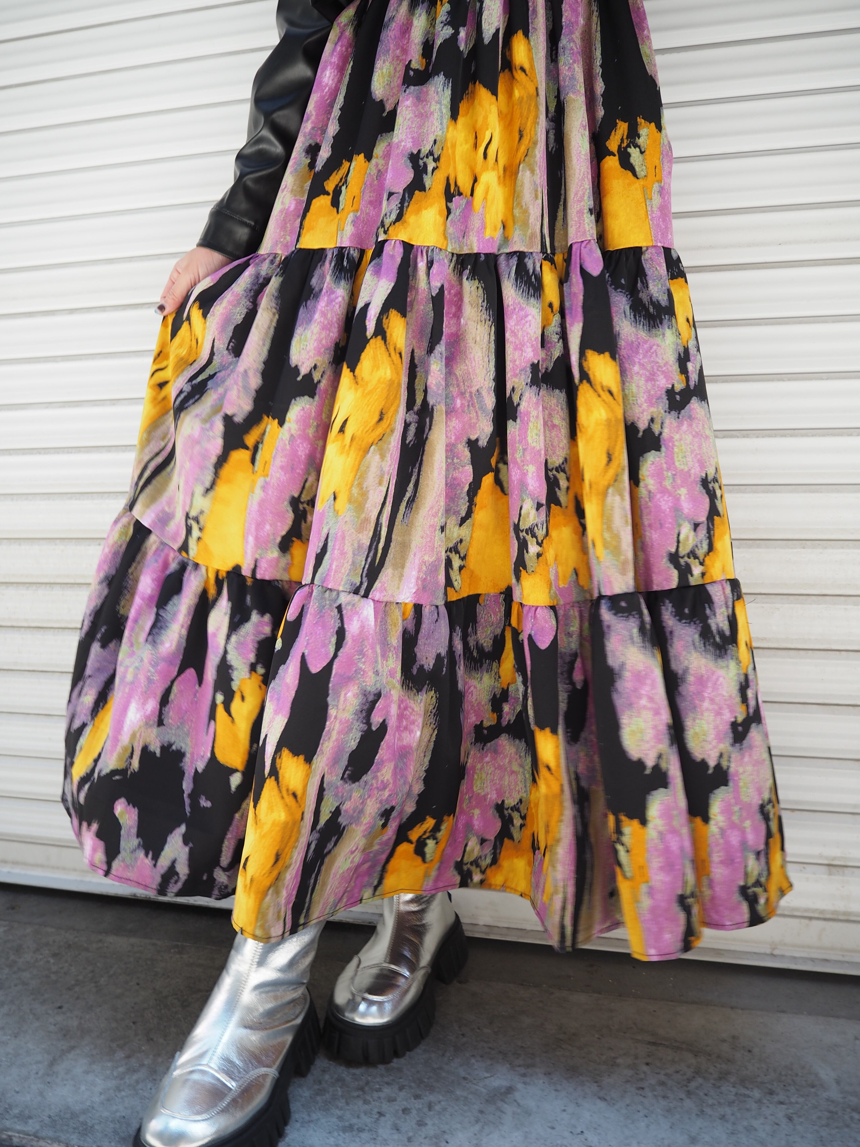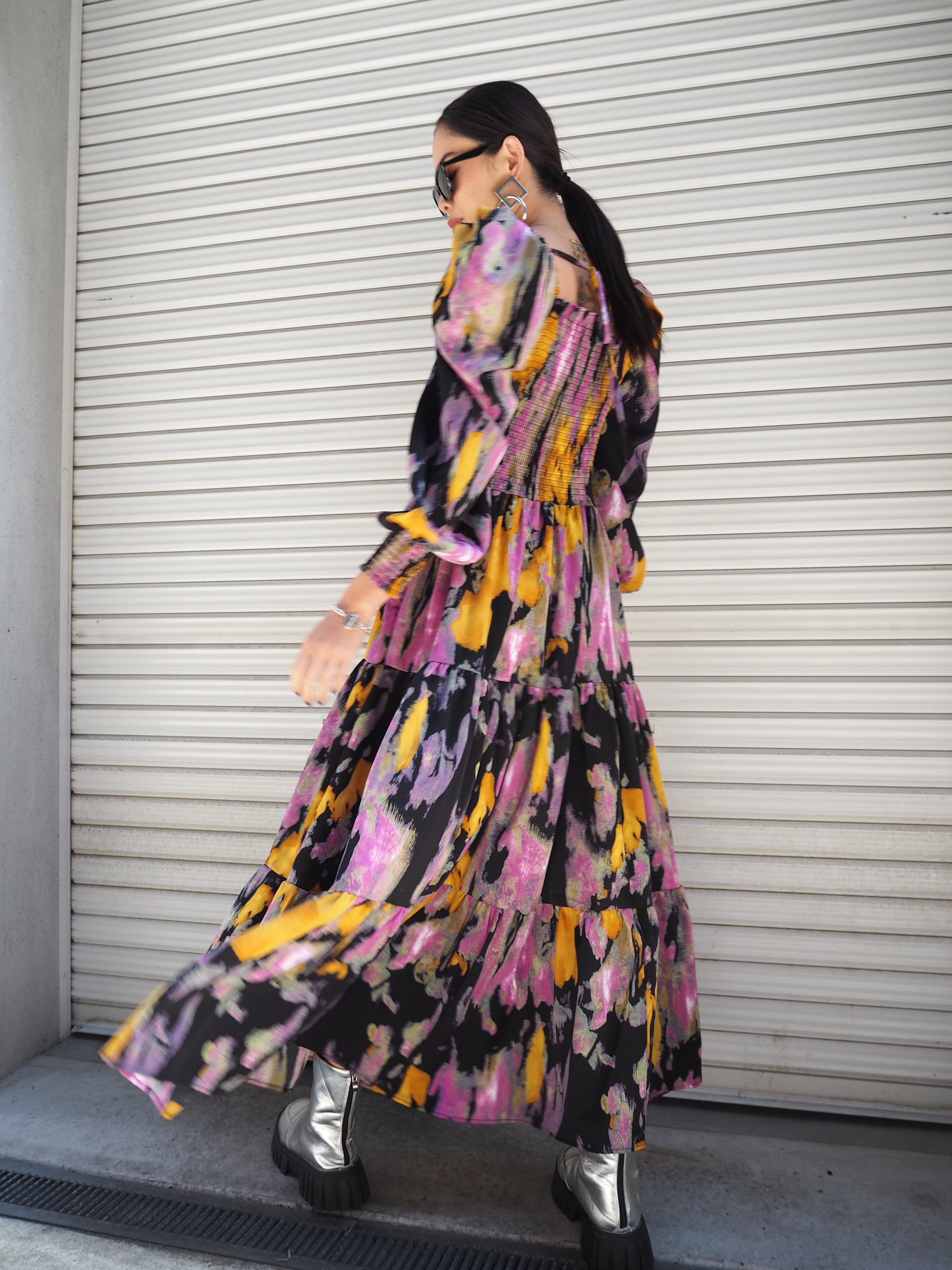 print shirring gather design long one-piece ワンピース ロングワンピ 柄ワンピ シャーリング ギャザー
