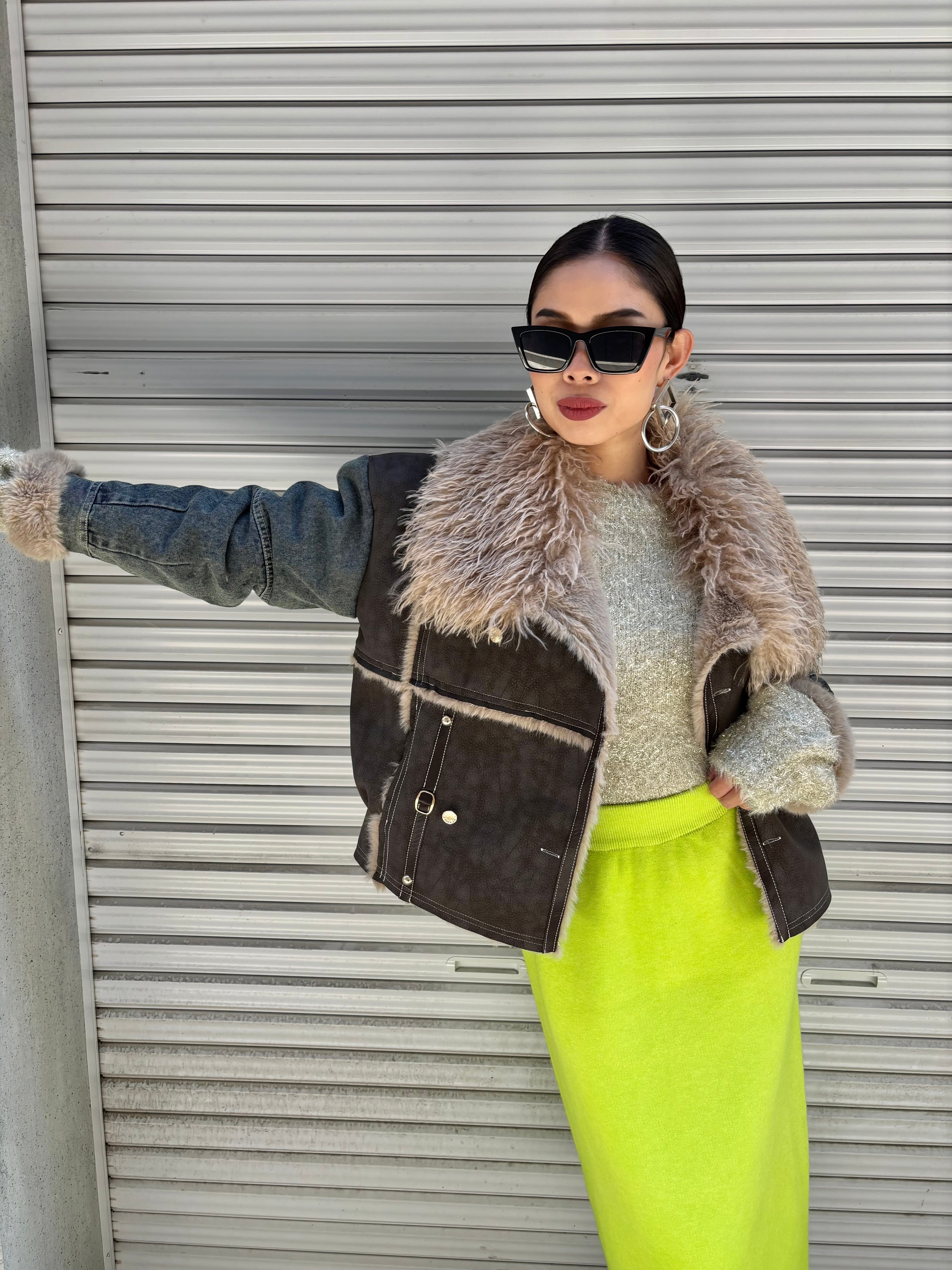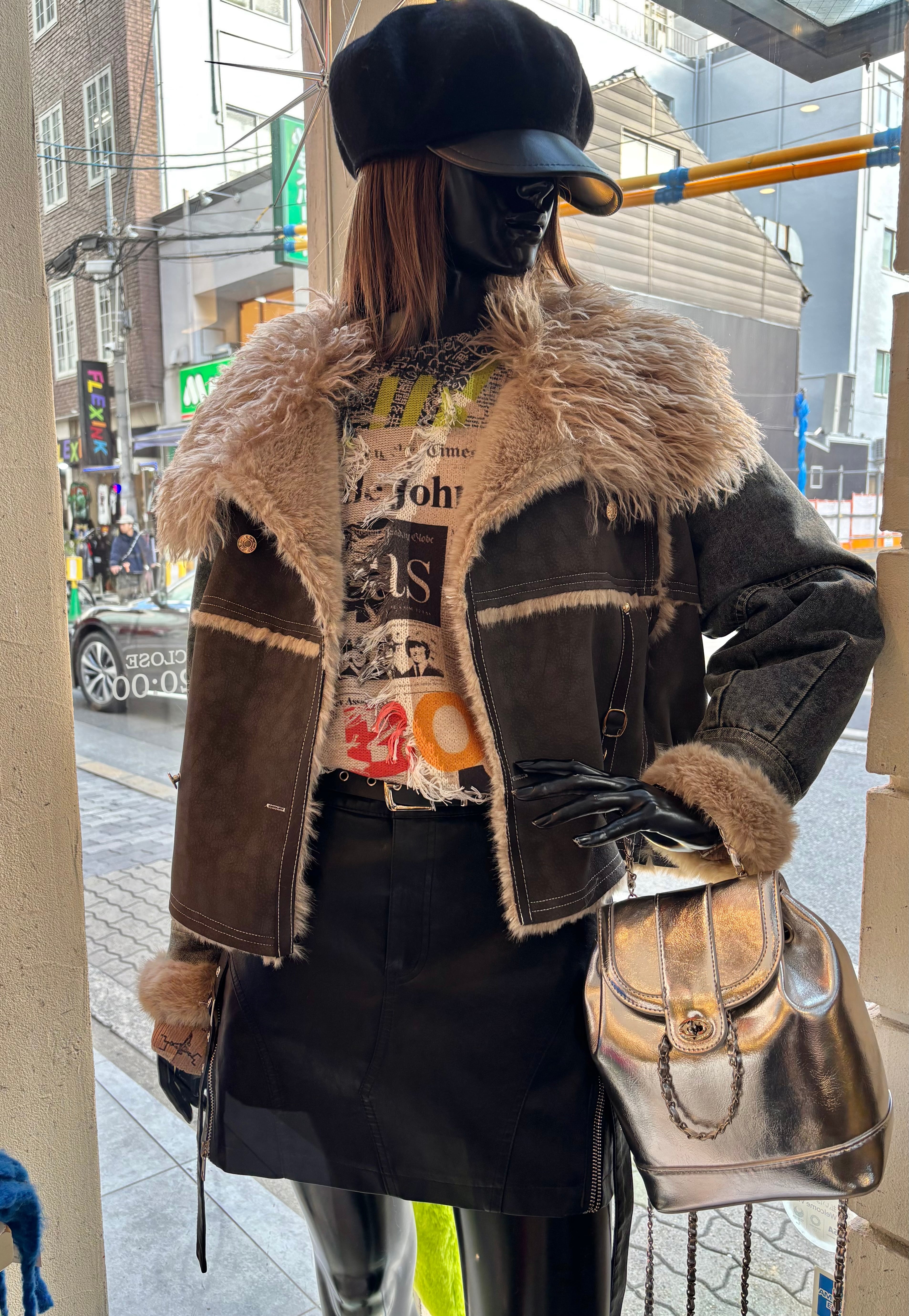 もこもこのフェイクムートンとカジュアルなデニムの組み合わせが個性的で