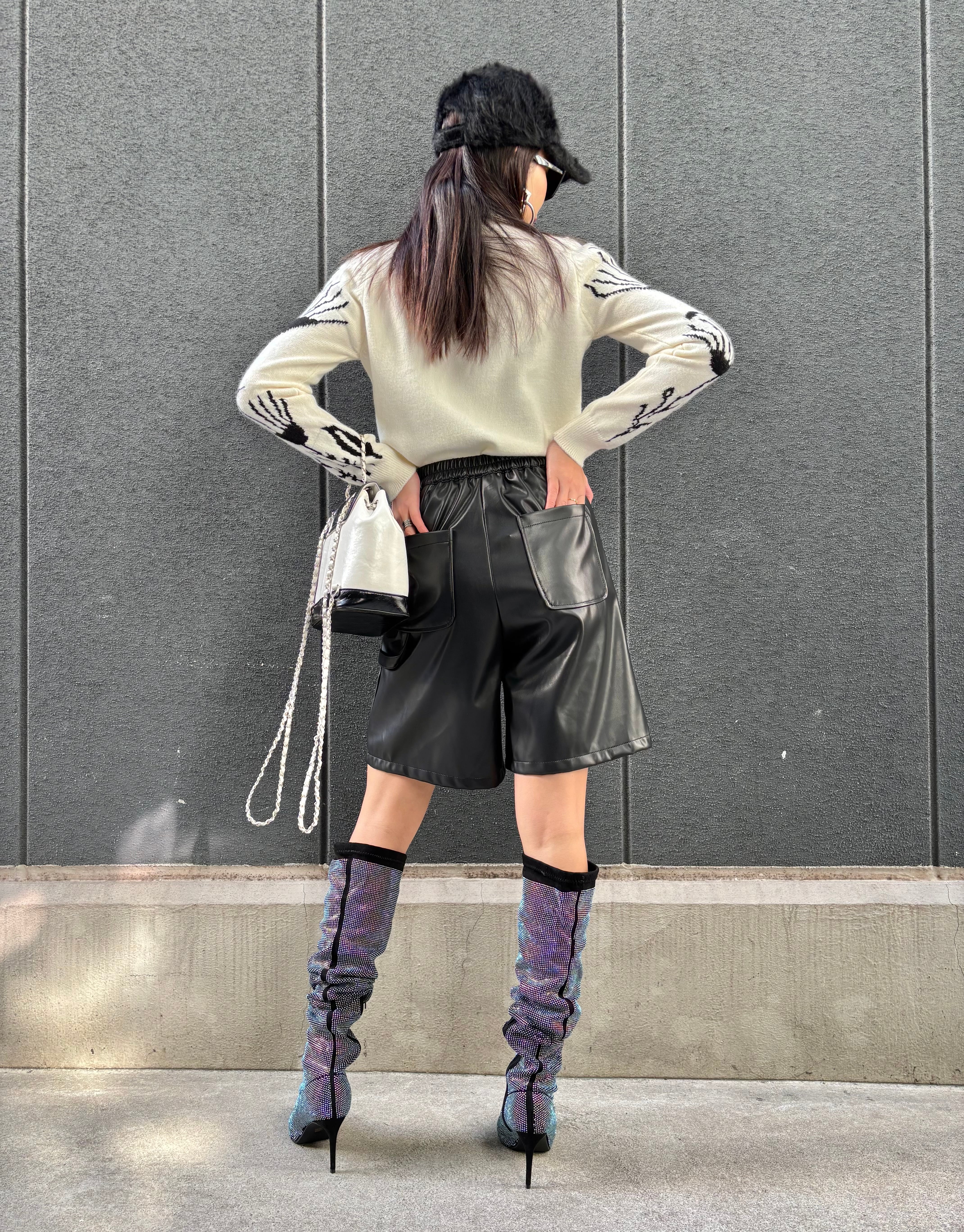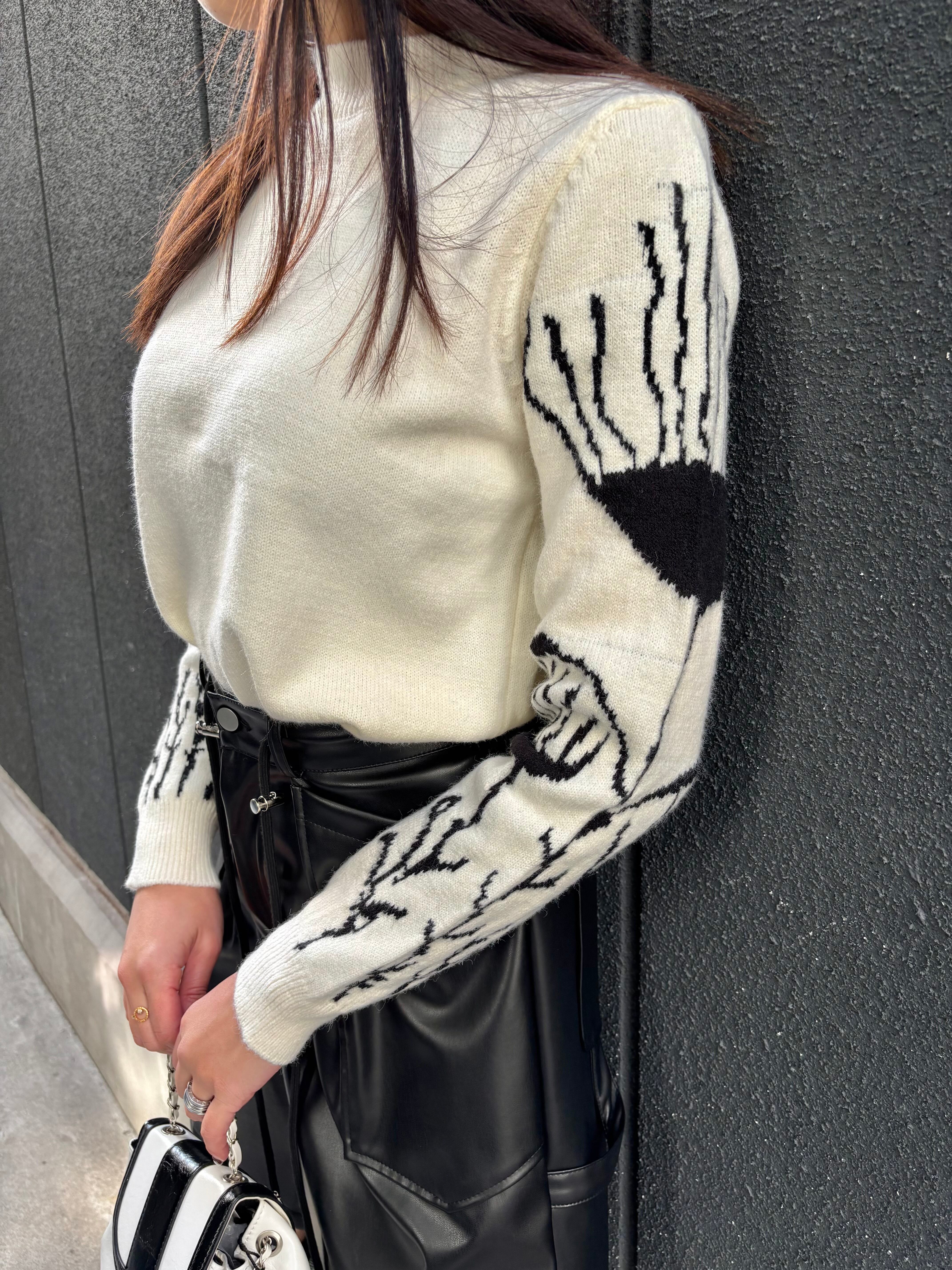 bi-color flower motif sleeve design knit tops ニット トップス バイカラー 花 フラワー 白黒