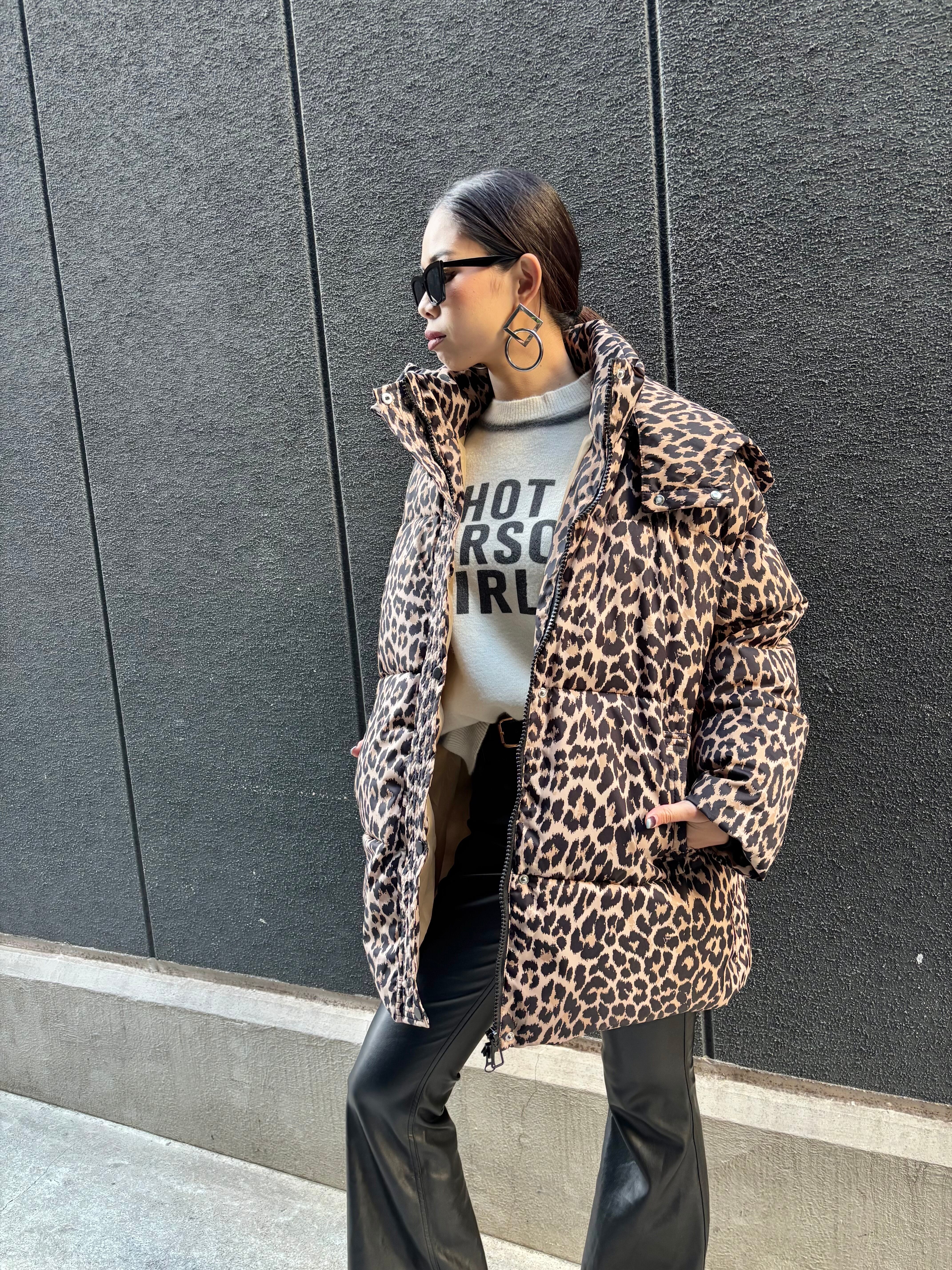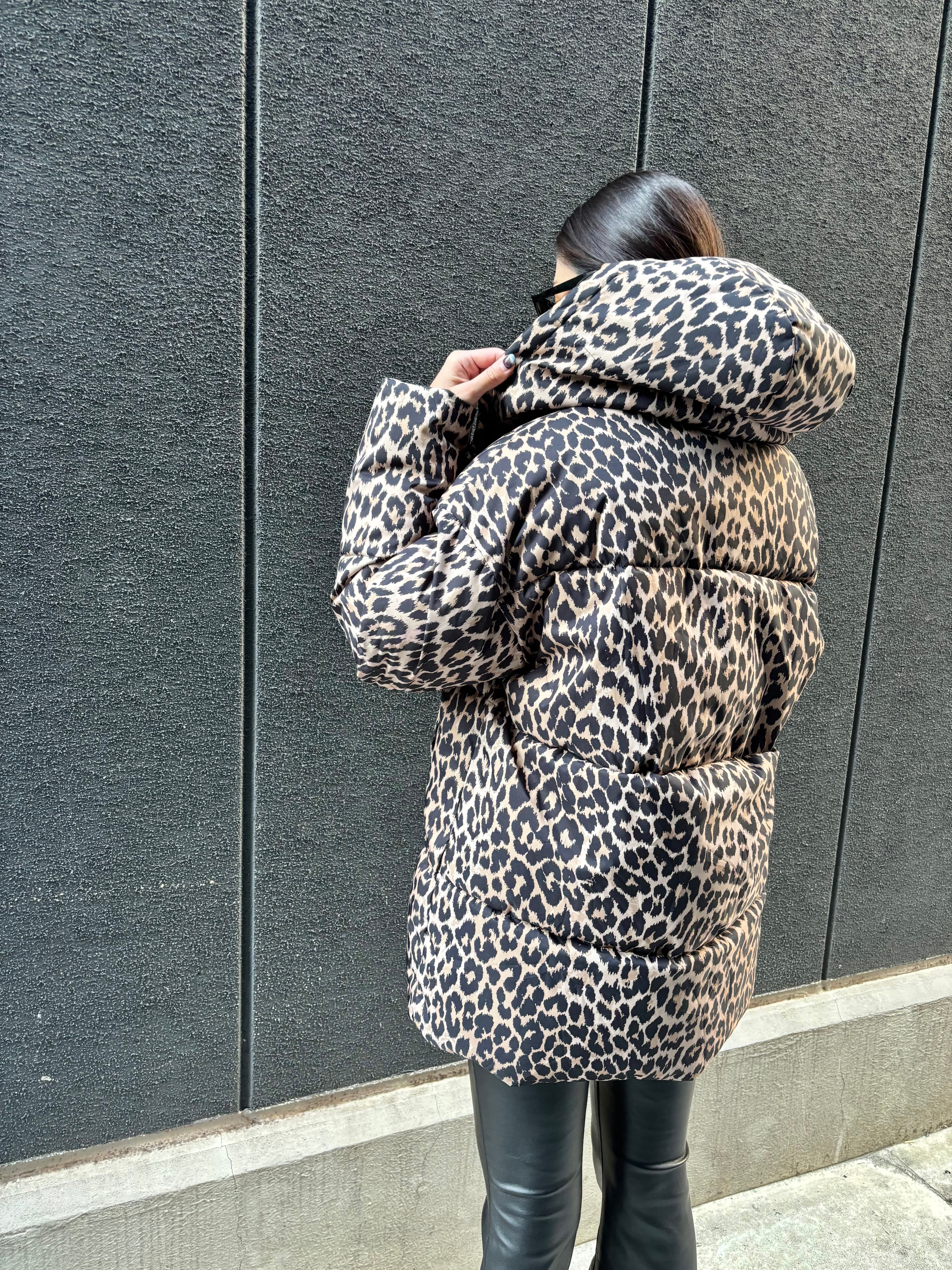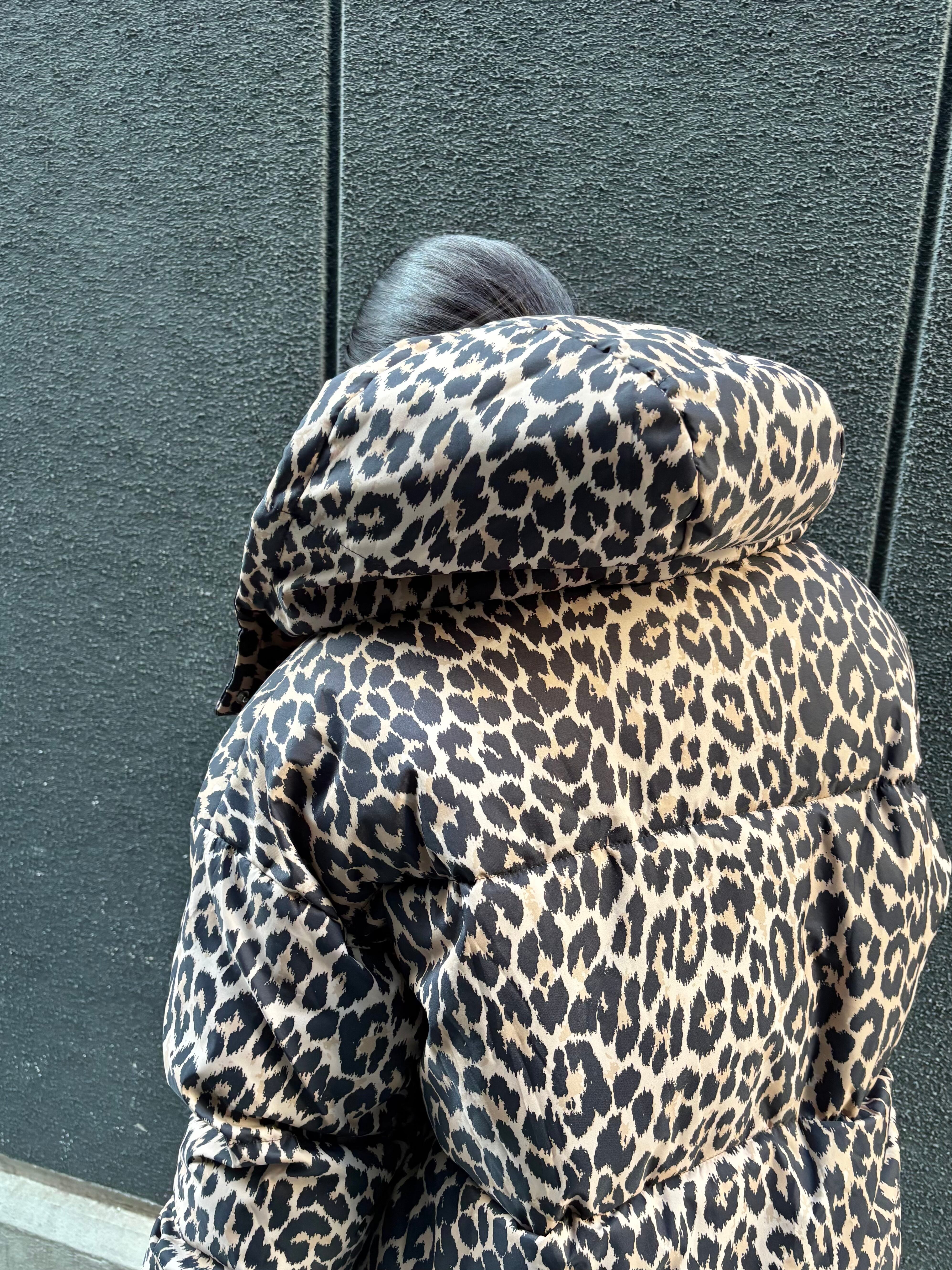 大胆なレオパード柄が目を引く、中綿使用のスタンドネックデザインで、寒い季節でも暖かさをキープします。