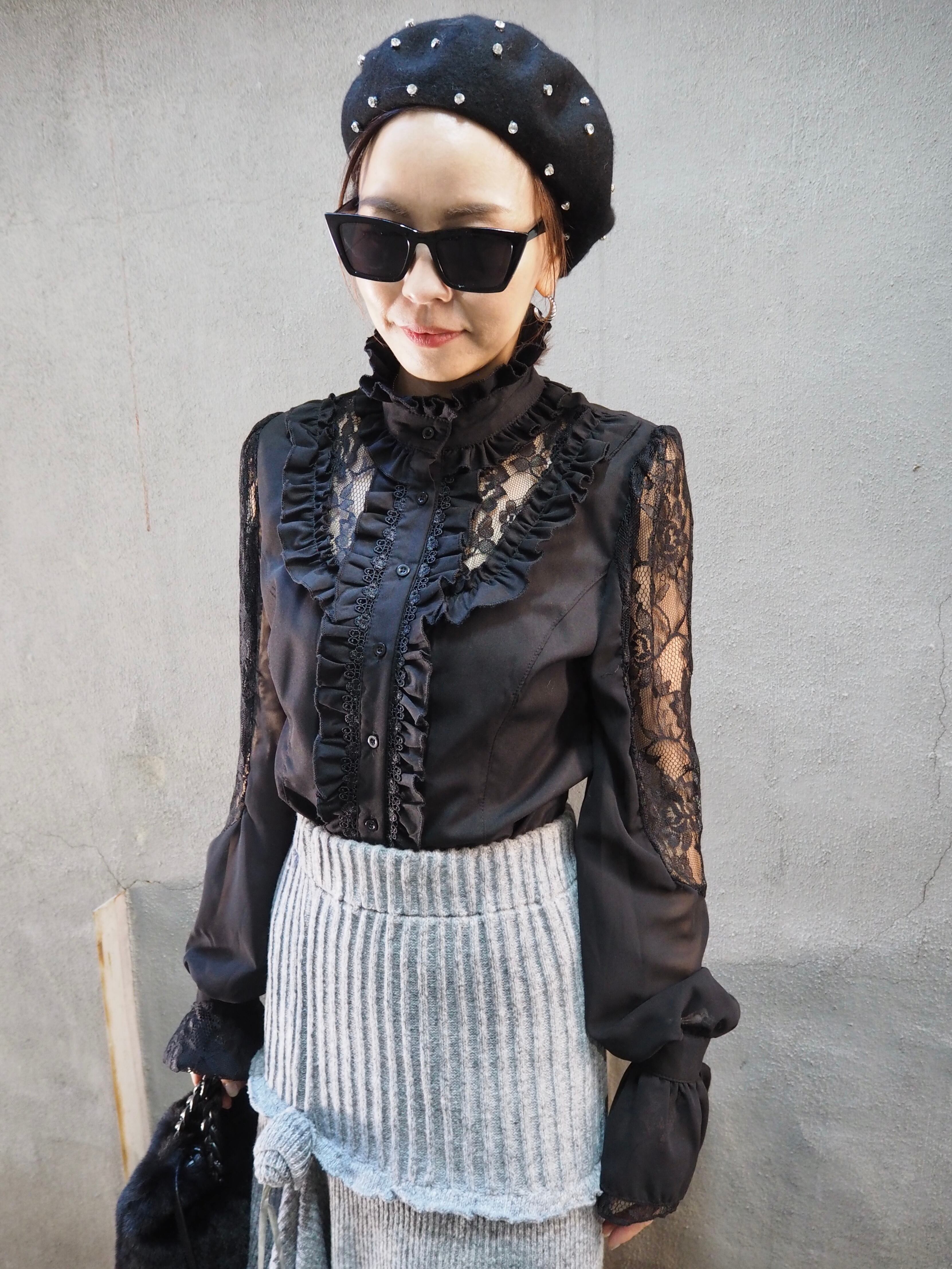 black lace × chiffon design blouse ブラウス レース シフォン シャツ 黒 ブラック