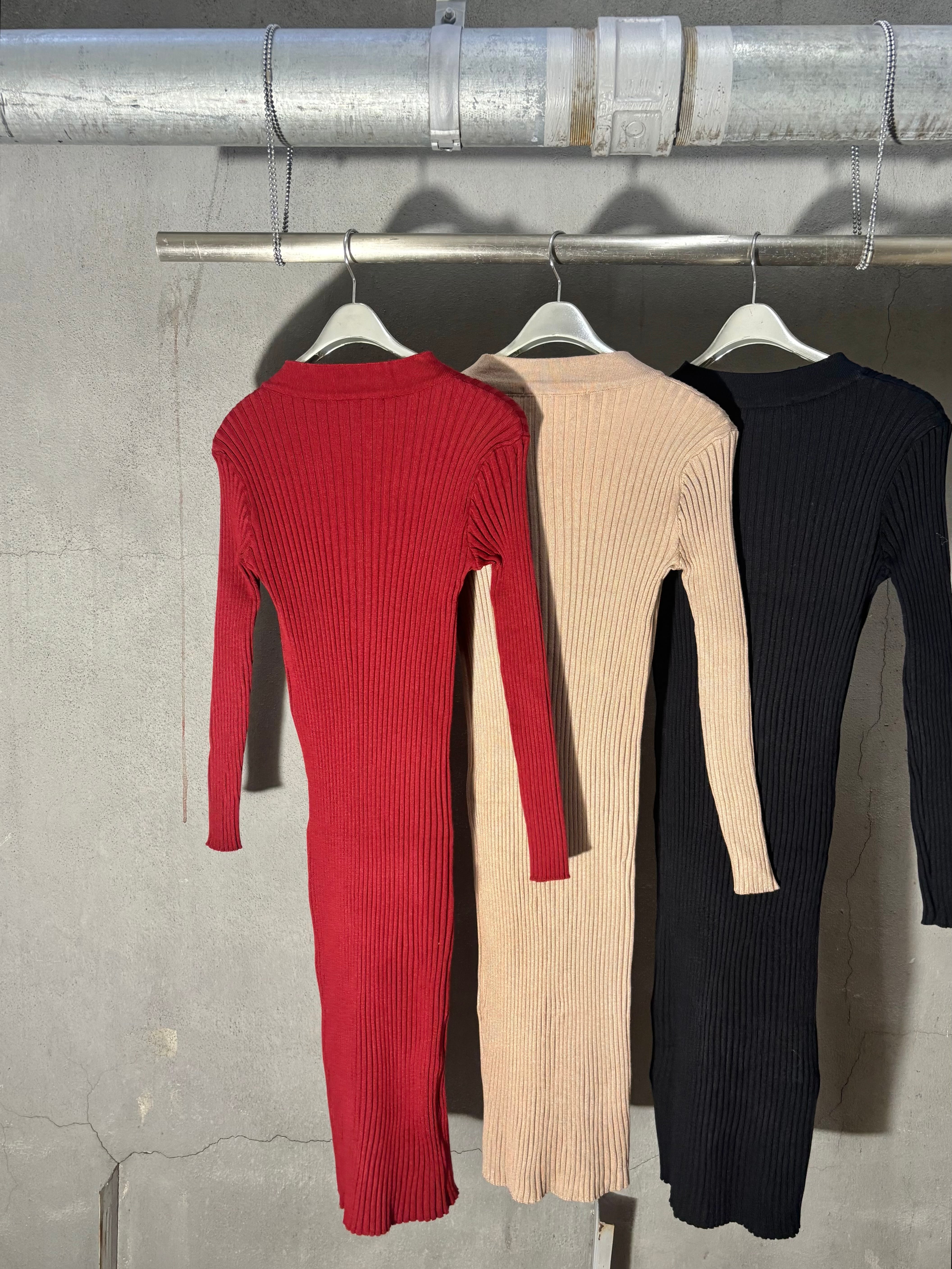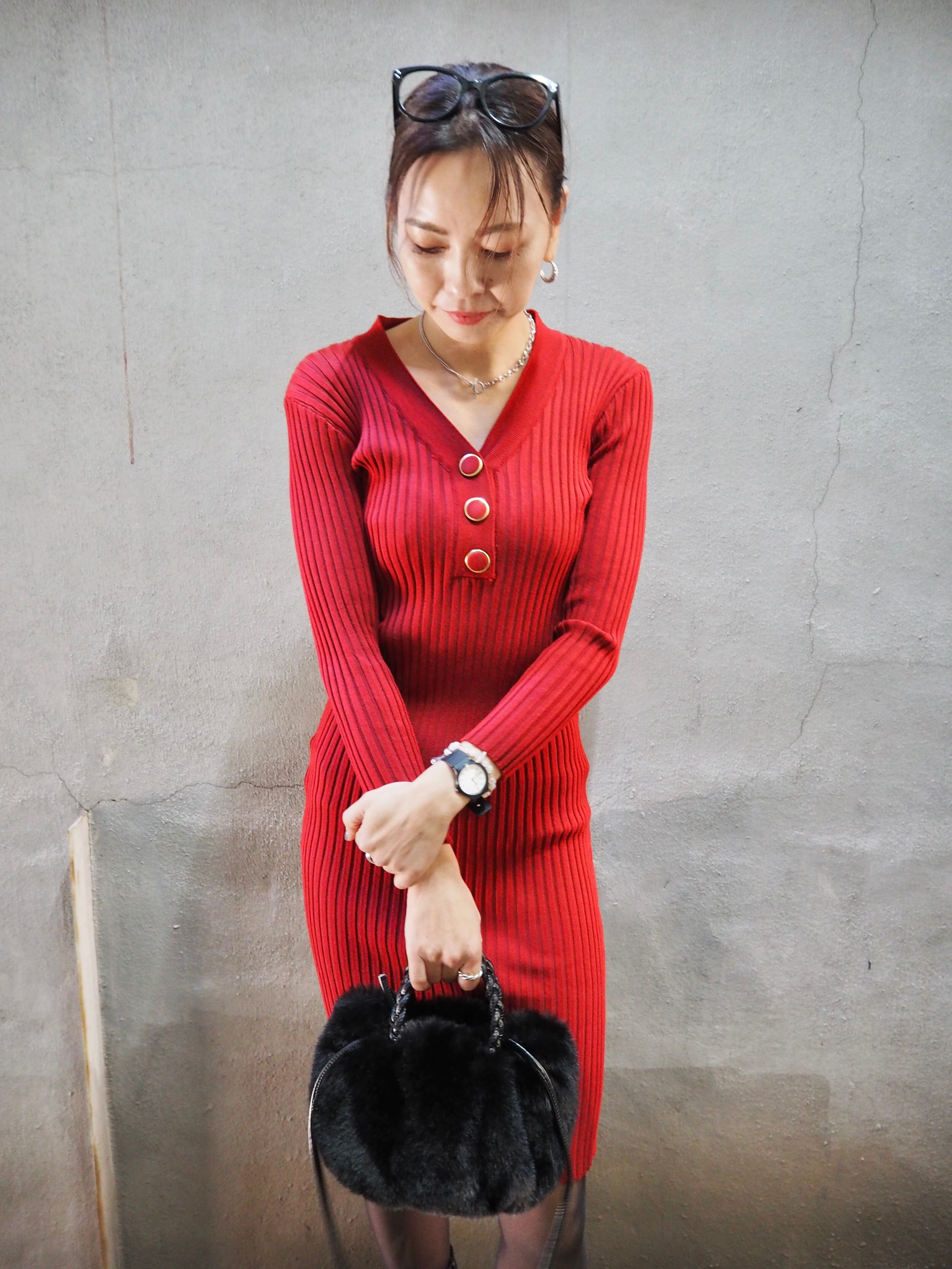 rib knit button V-neck tight one-piece ワンピース ニット ニットワンピ リブニット タイト 細身 ぴったりめ Vネック