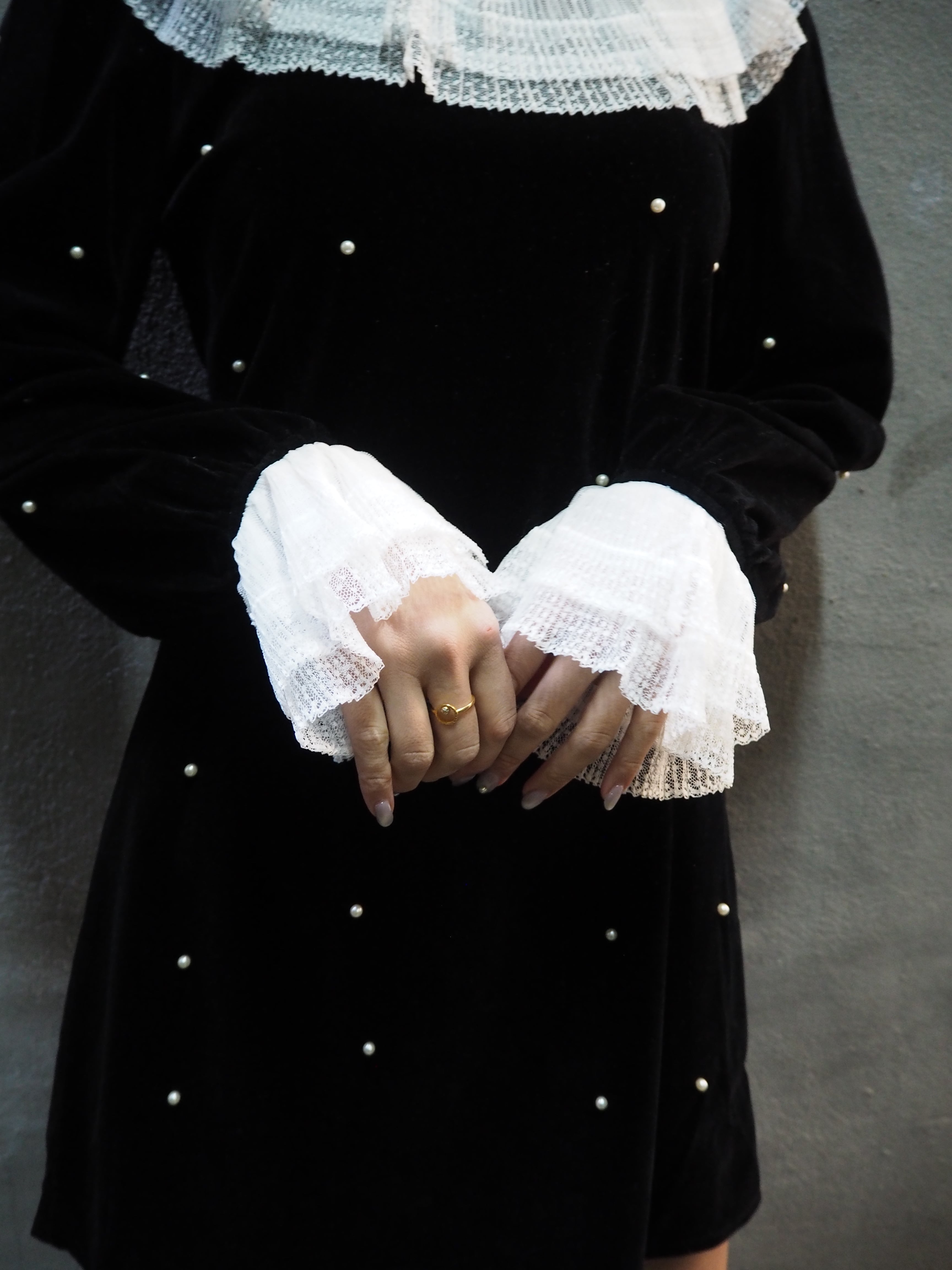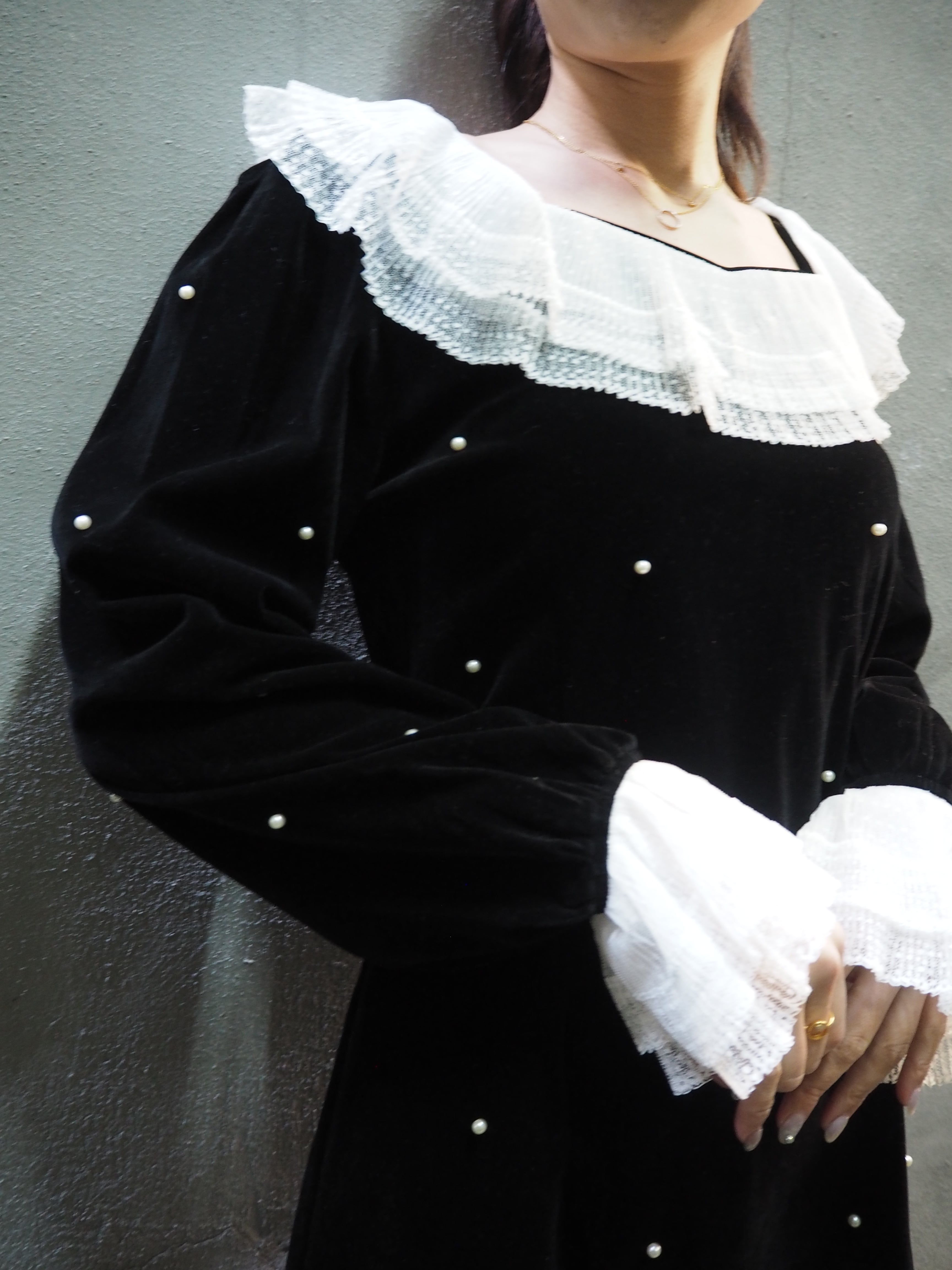 velours × pearl white lace frill neck design mini one-piece ワンピース ミニワンピ ドレス ベロア レース 可愛い