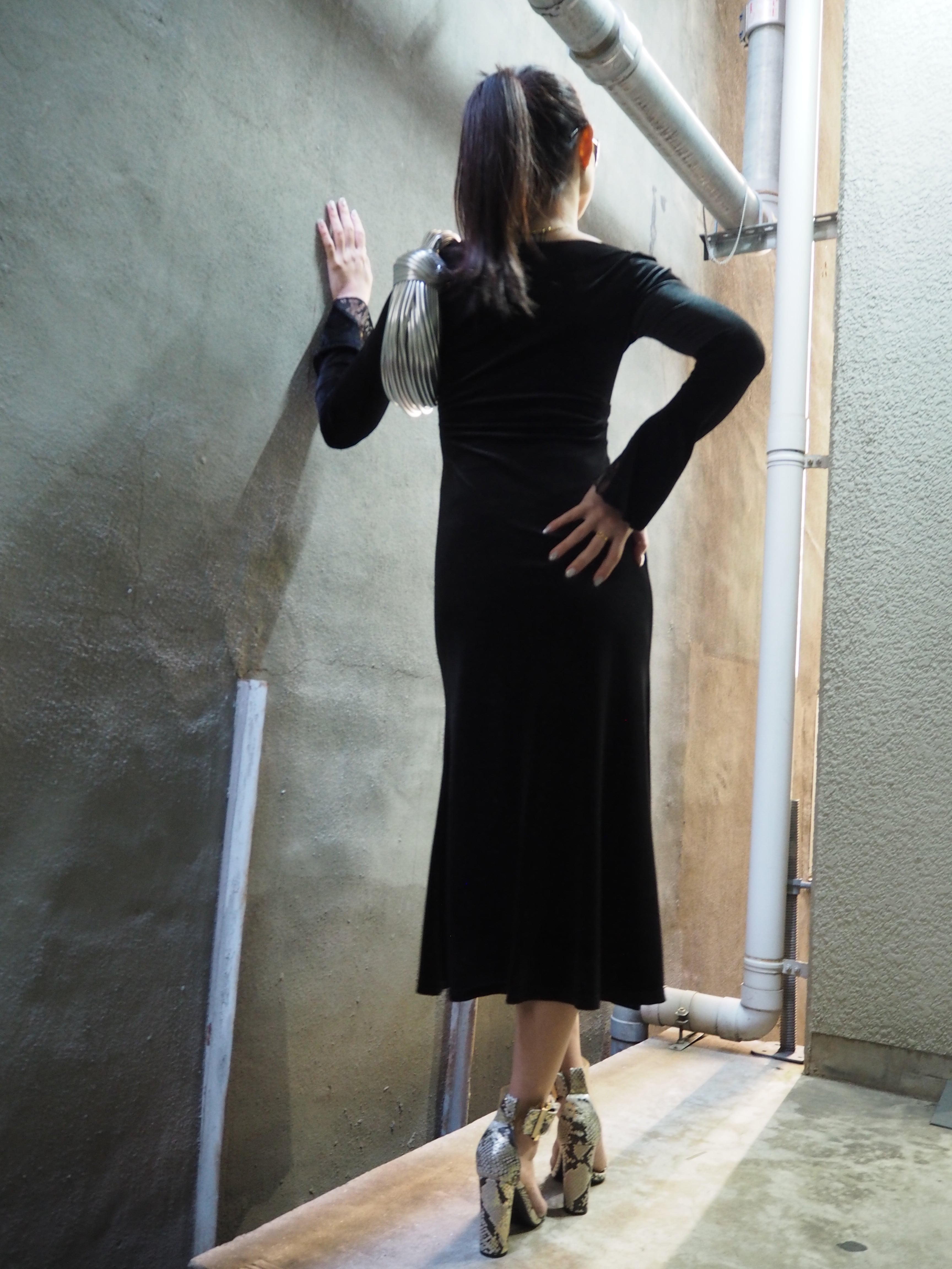 velours × lace change design off shoulder one-piece ワンピース ベロア レース オフショルダー ブラック 黒 結婚式 二次会 パーティー ドレス