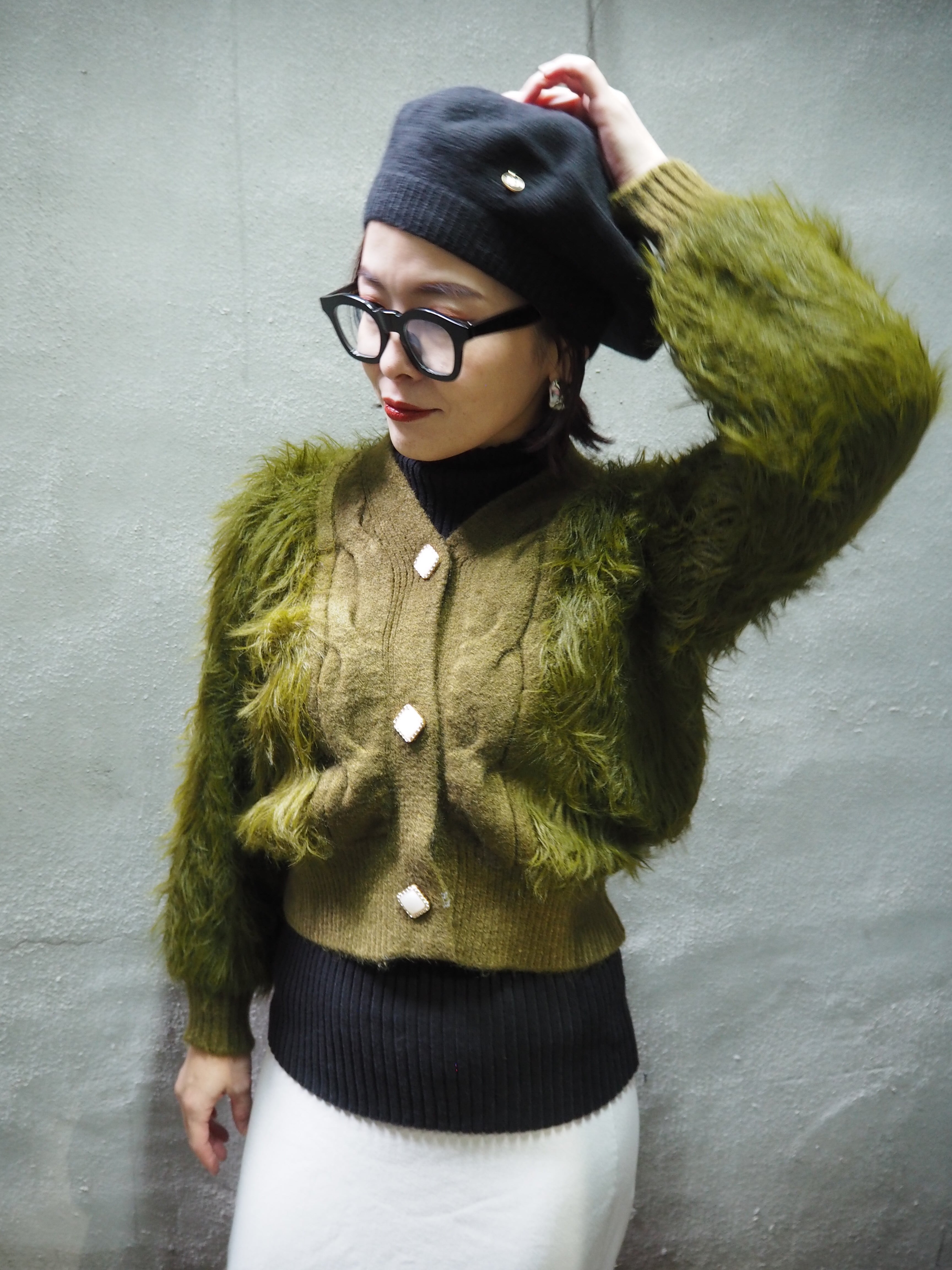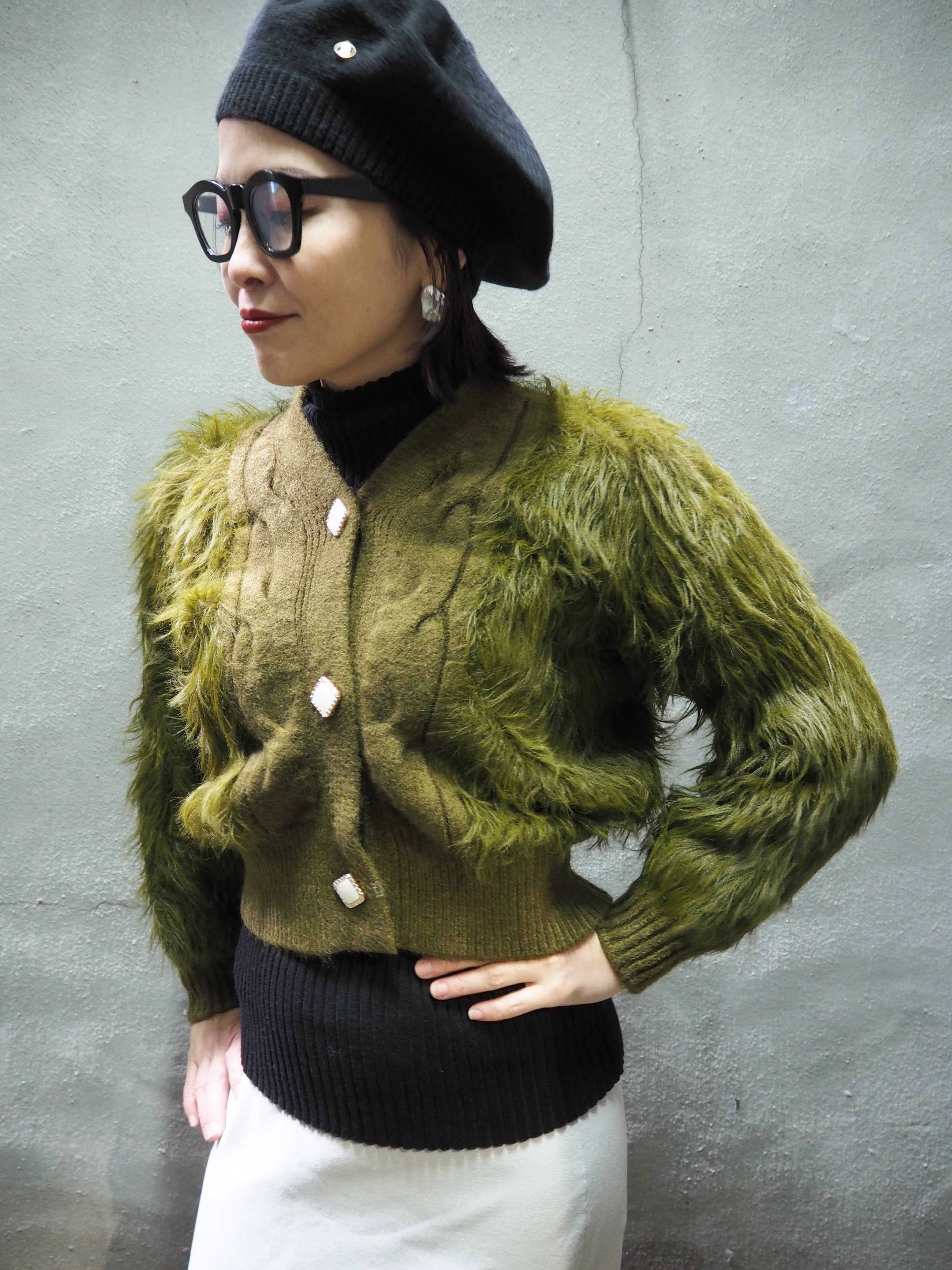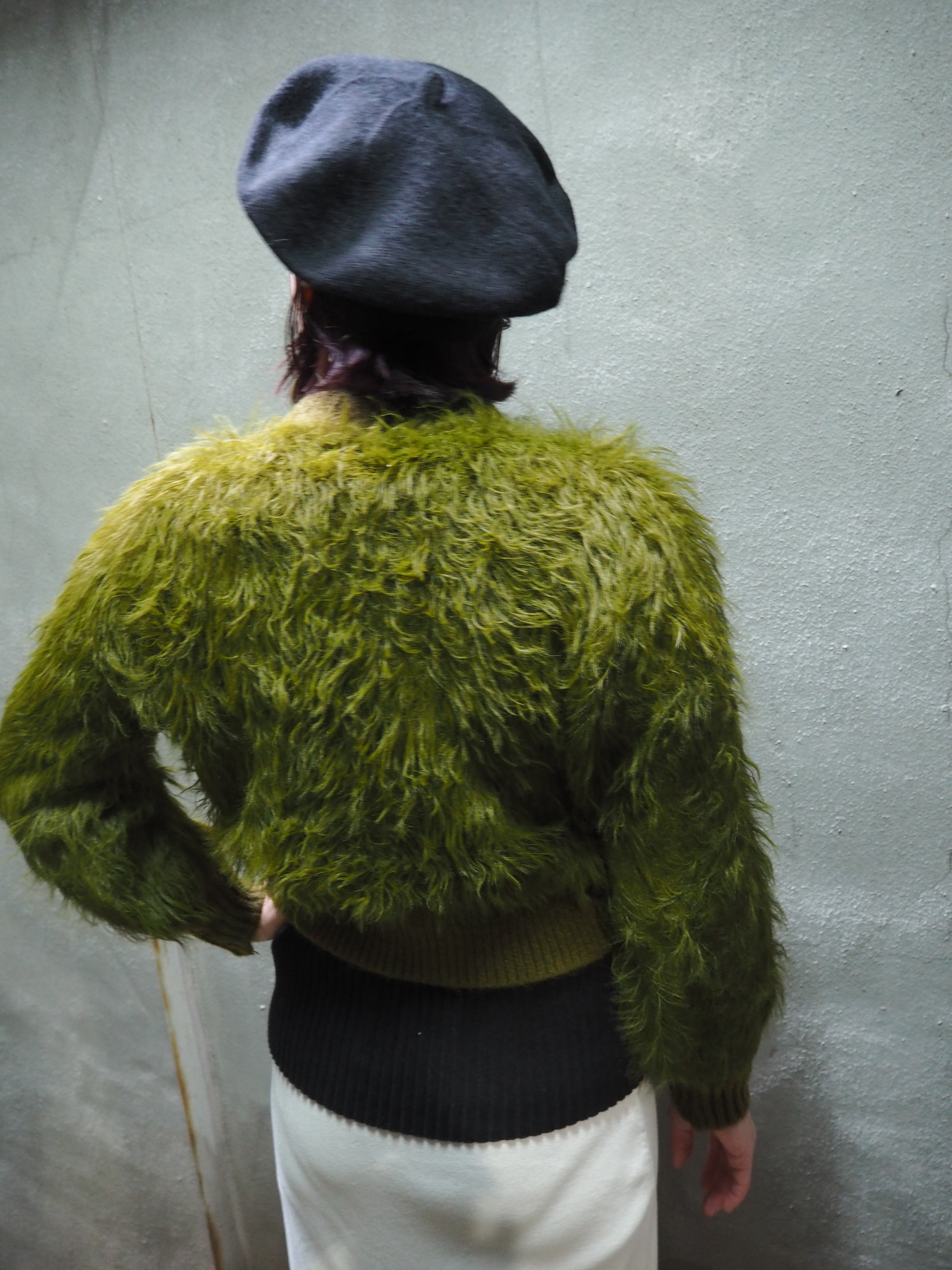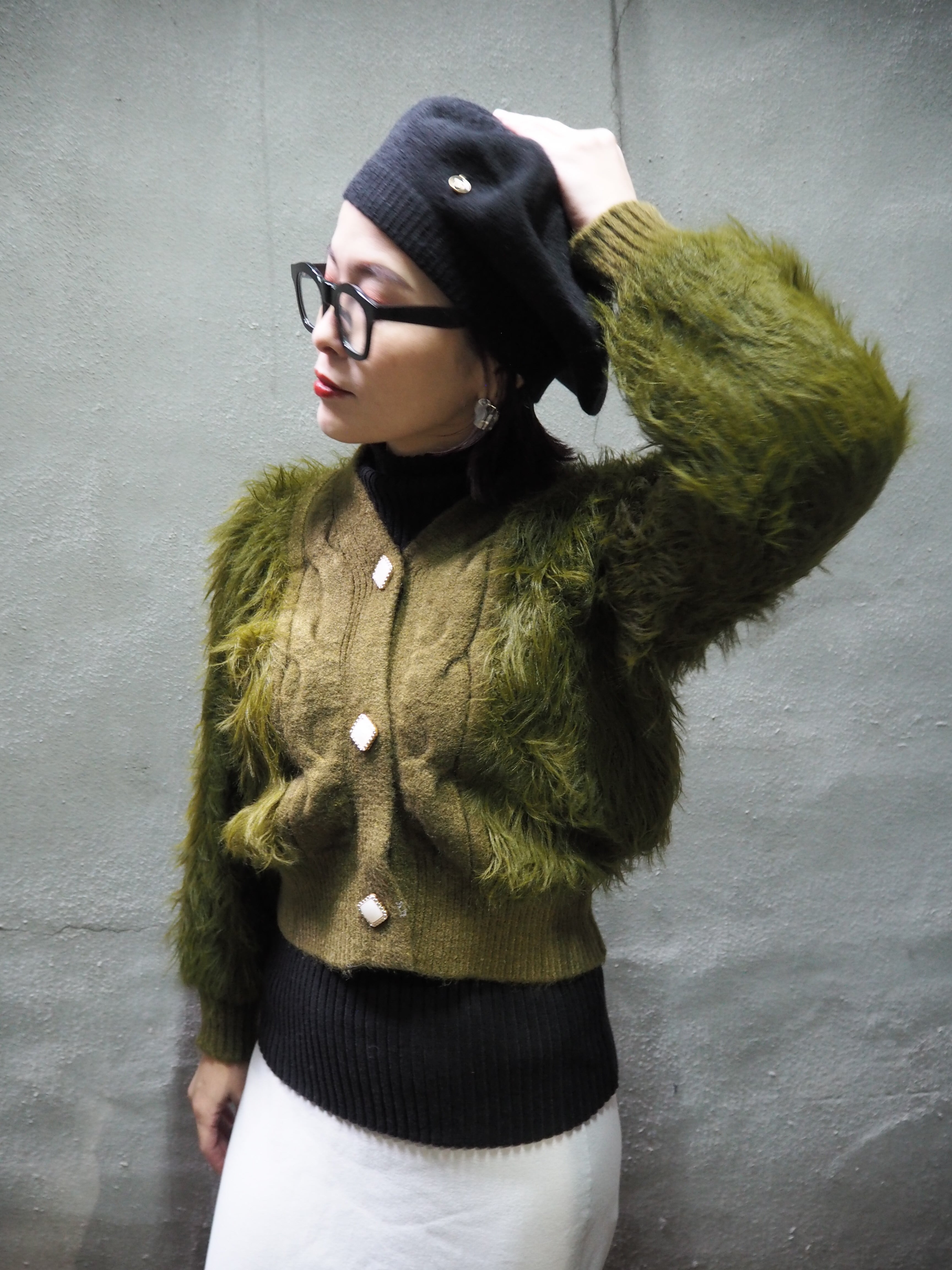 long shaggy knit short cardigan ニット カーディガン ショート丈 シャギー カーキ