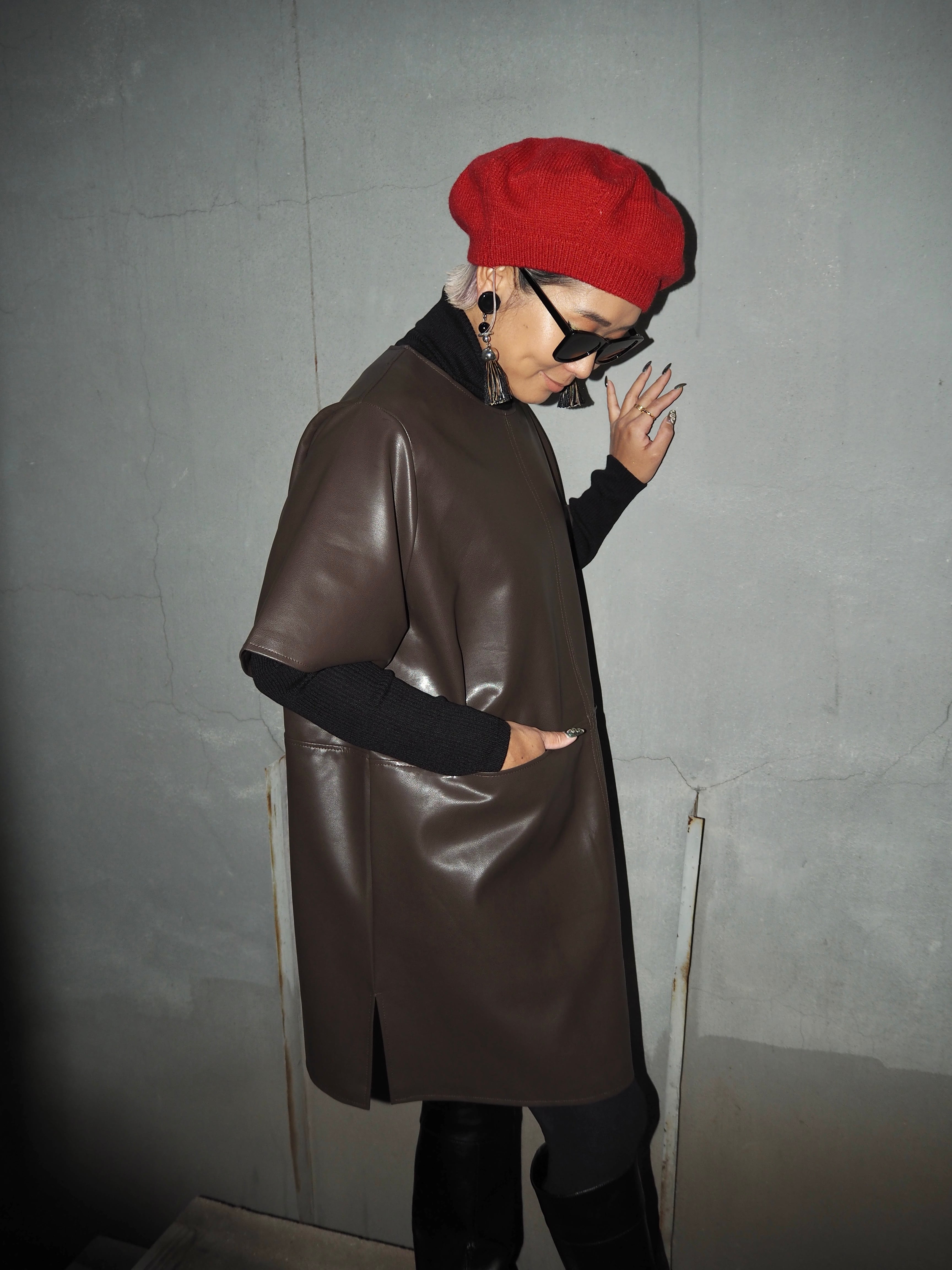 フェイクレザーならではの独特な質感が、スタイリングに個性を加え