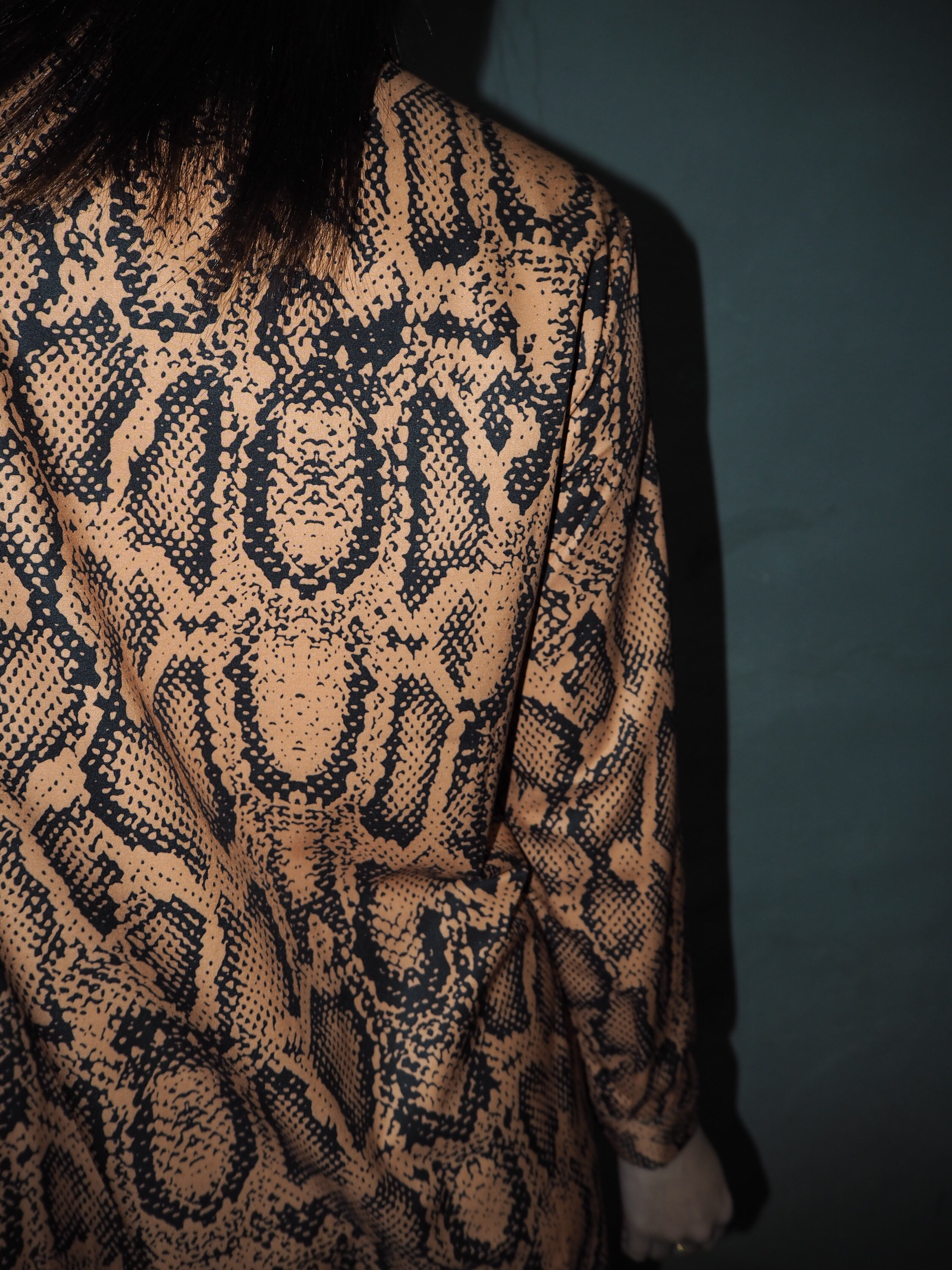 orange python pattern shirt collar one-piece ワンピース 柄ワンピ パイソン リボンベルト ボウタイリボン 襟付き