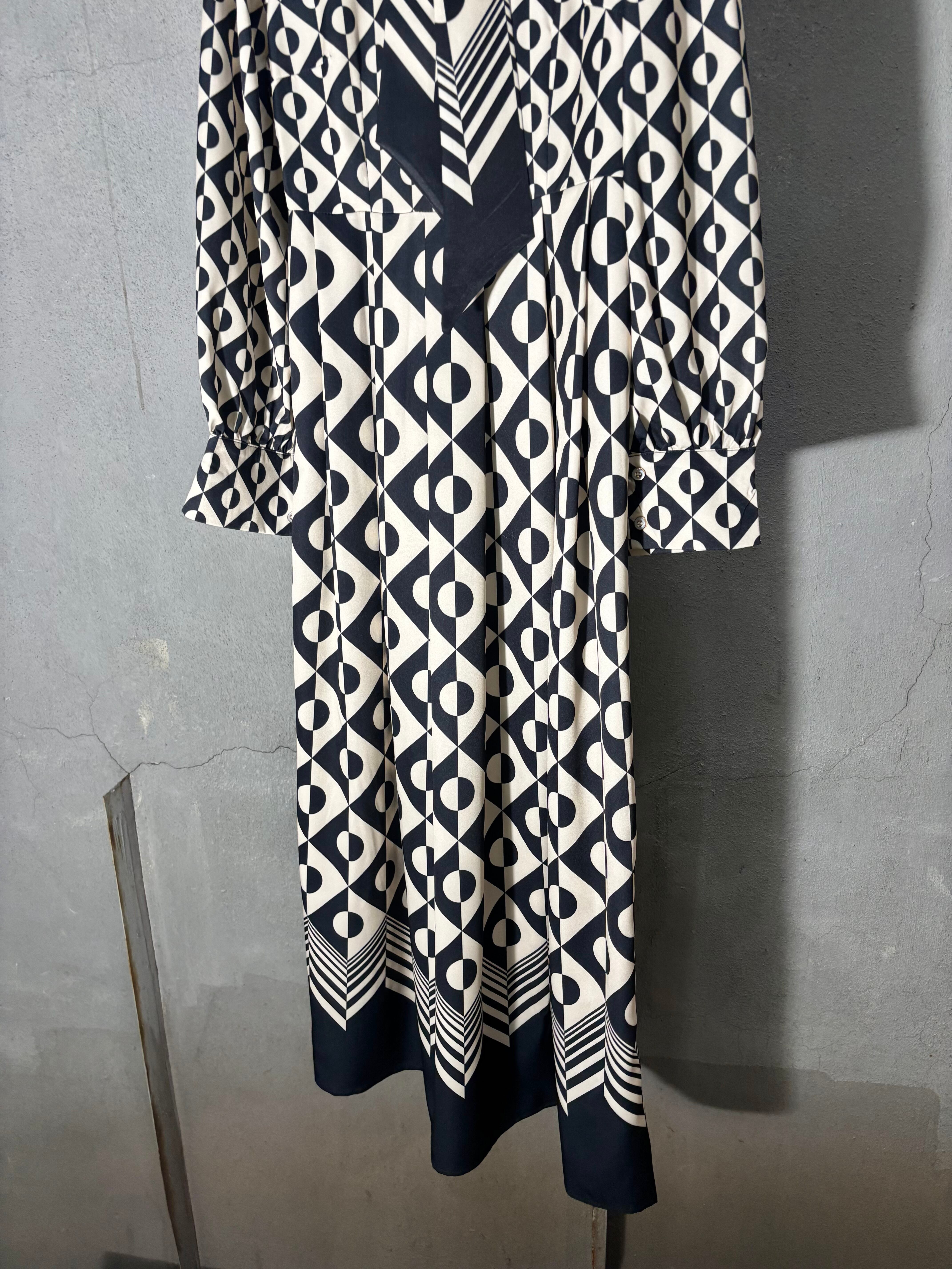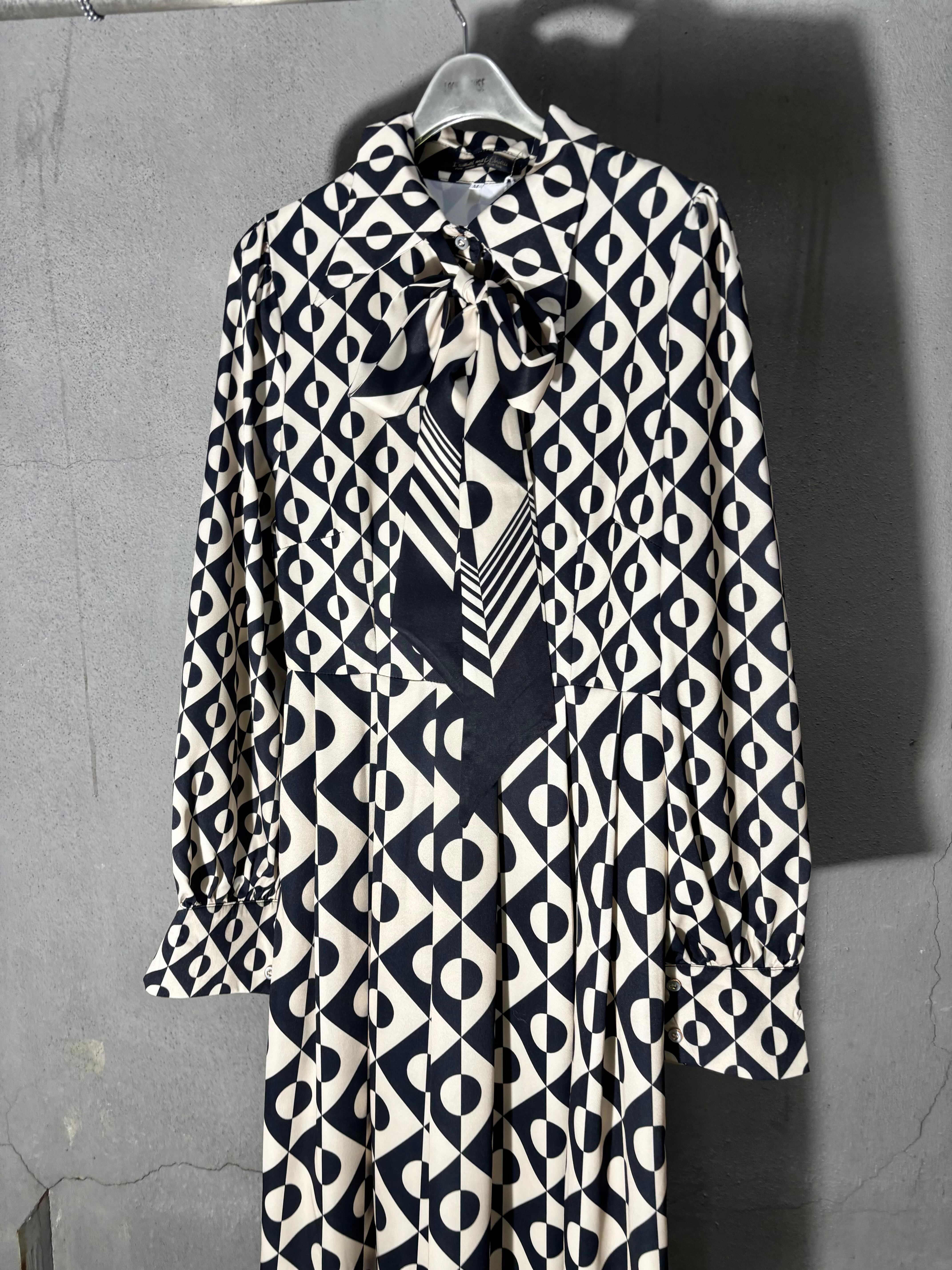 geometric pattern pleats change design long one-piece ワンピース 柄ワンピ ロングワンピ バイカラー リボンベルト ボウタイリボン