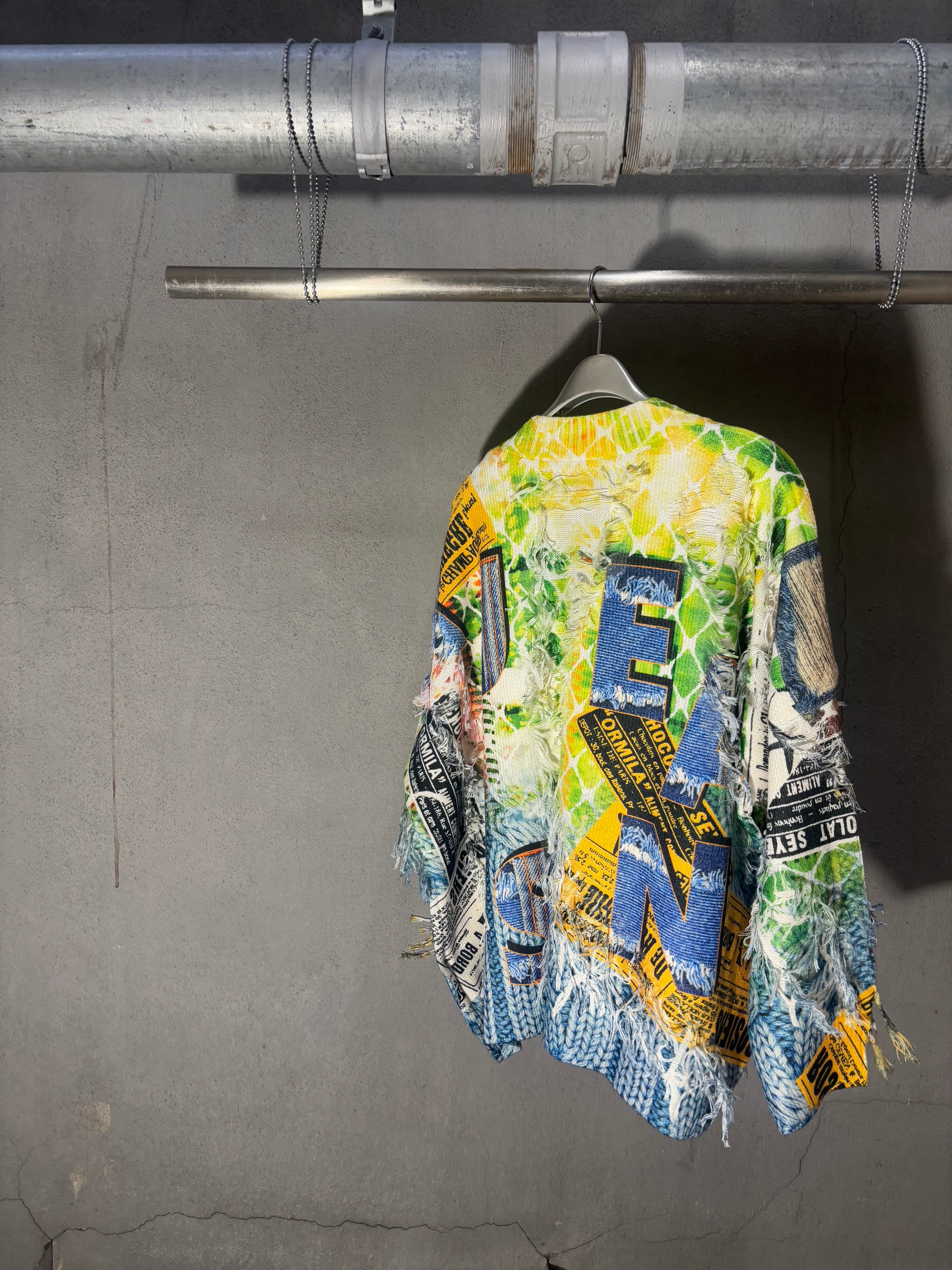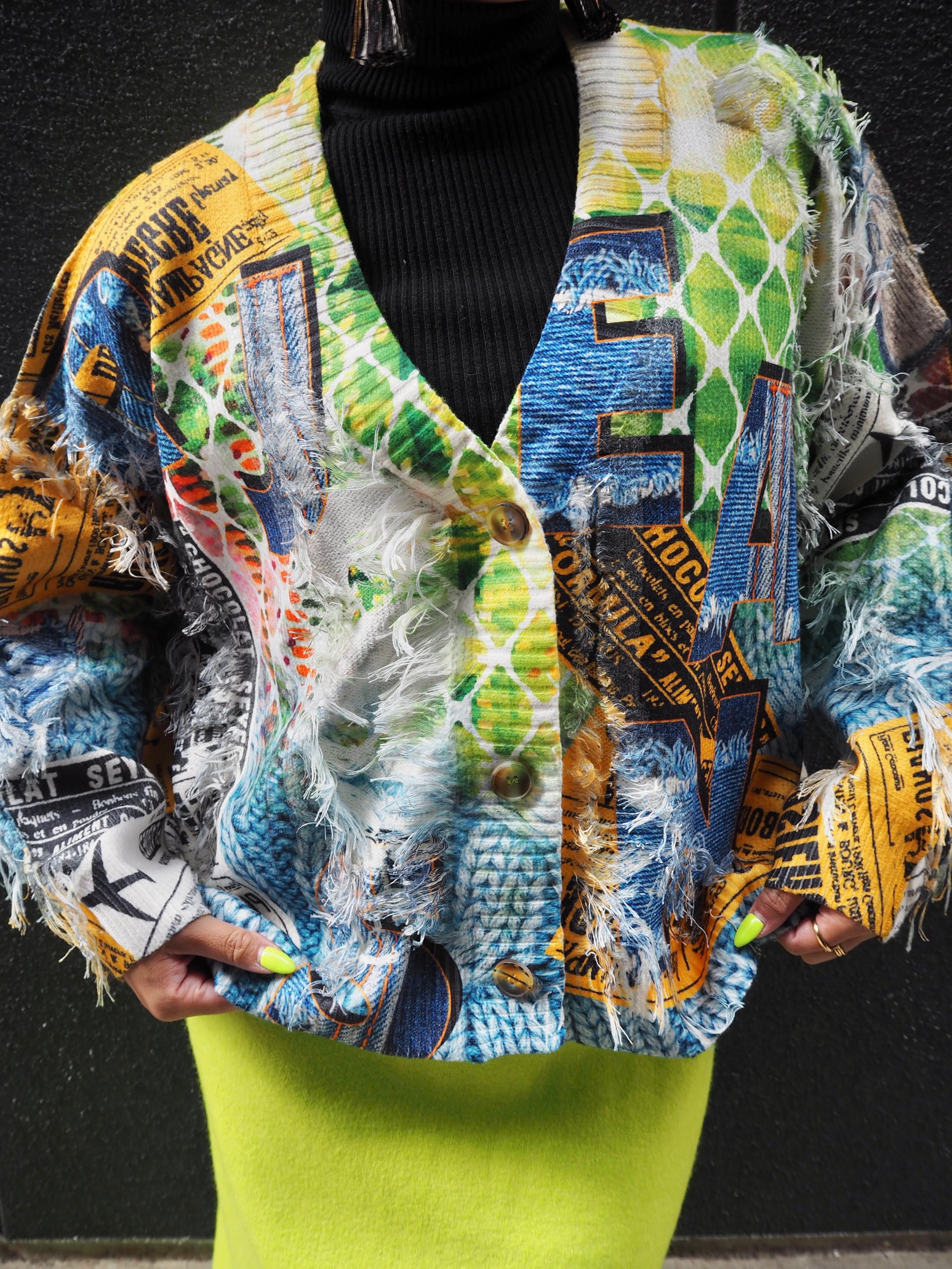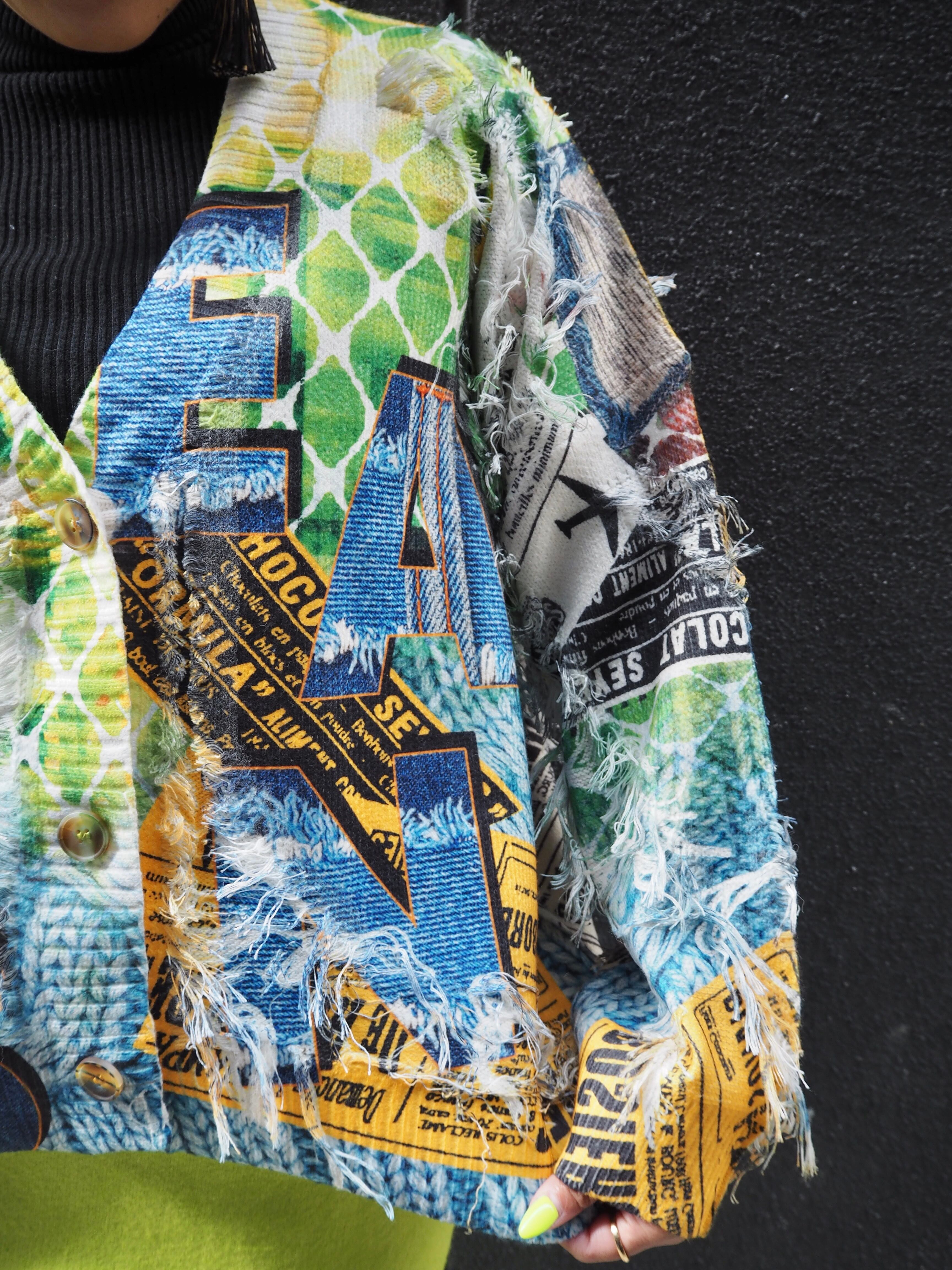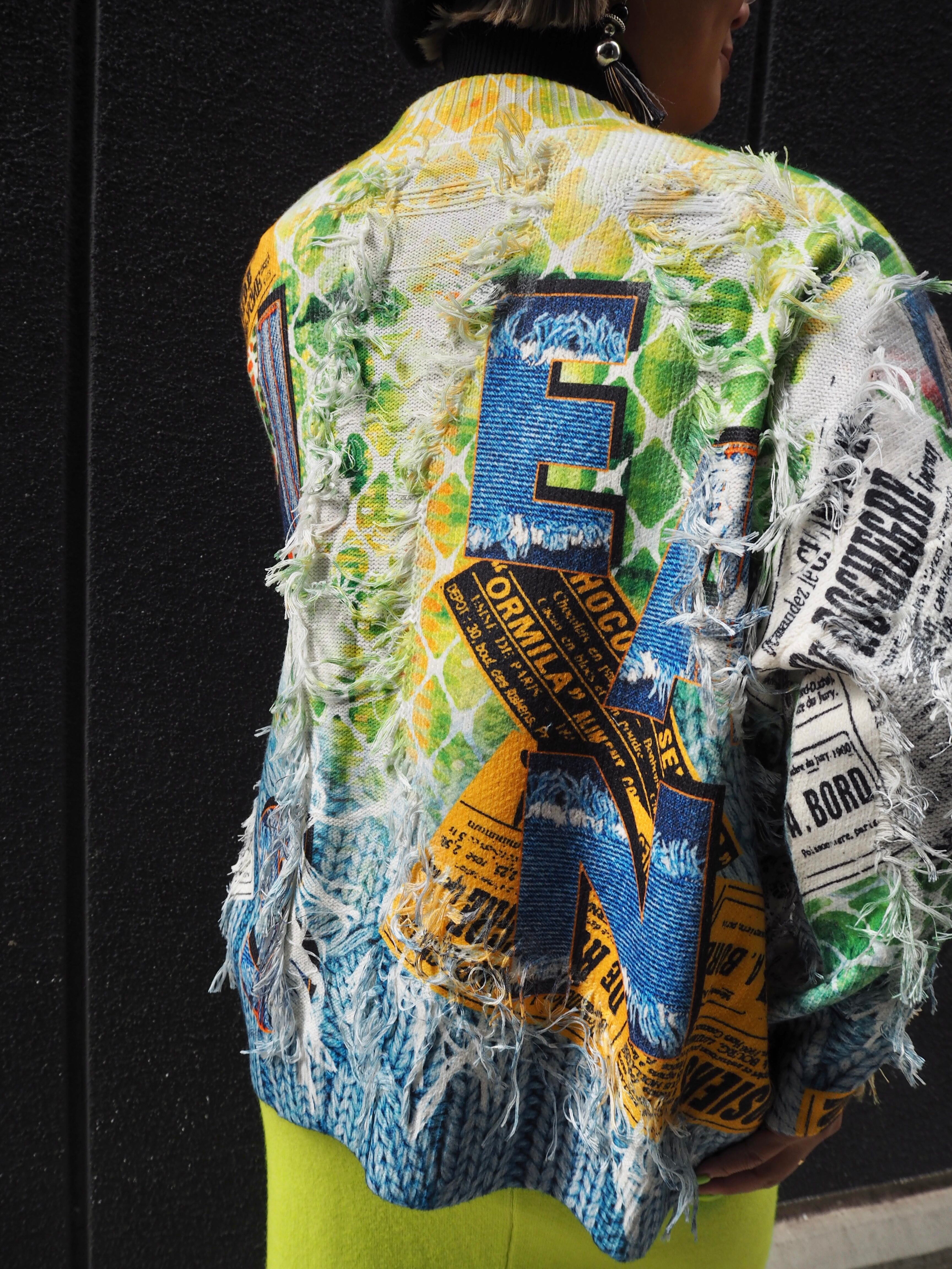 damage × mix print design knit cardigan ニット カーディガン Vネック プリント 転写 ダメージ