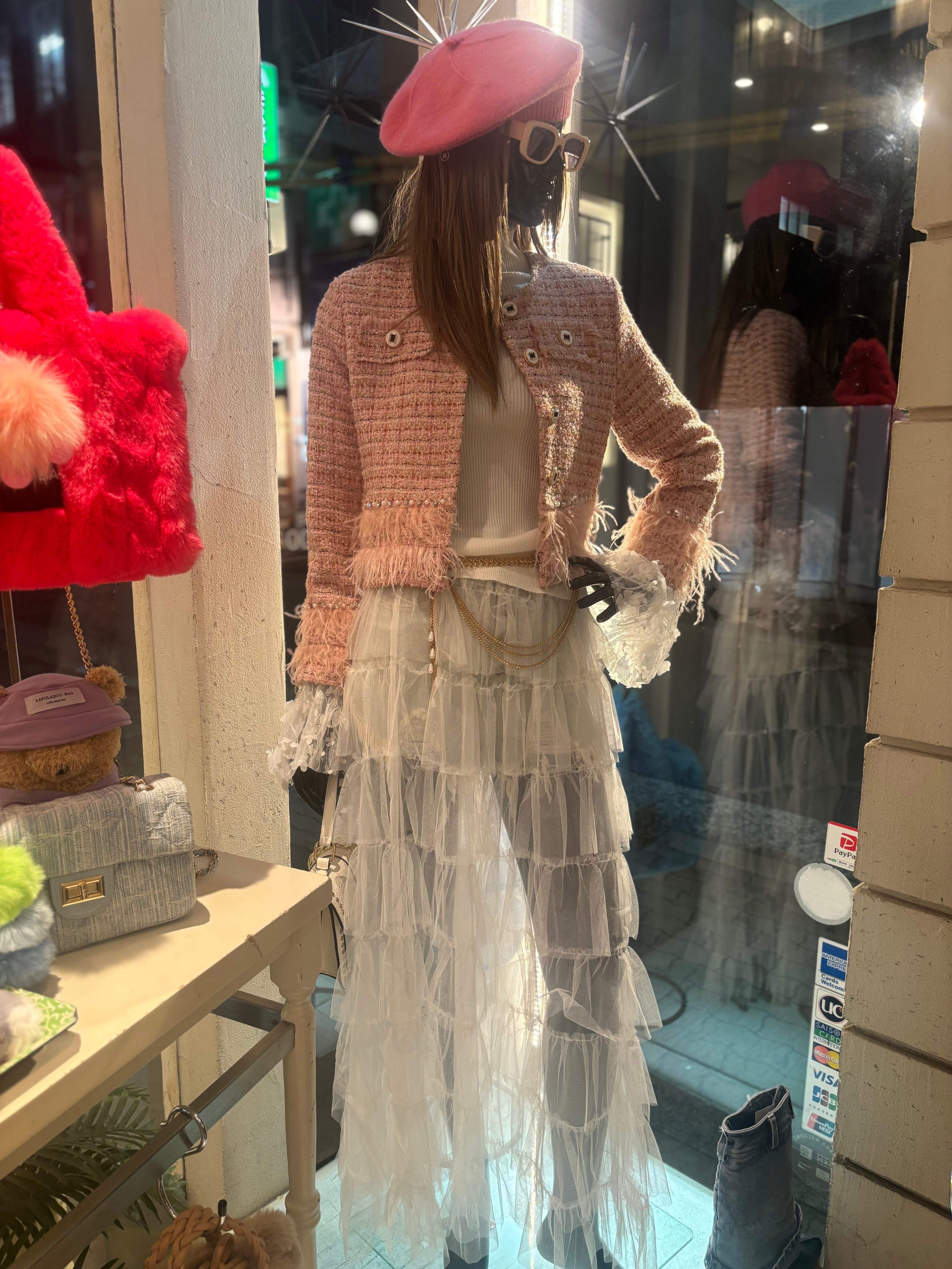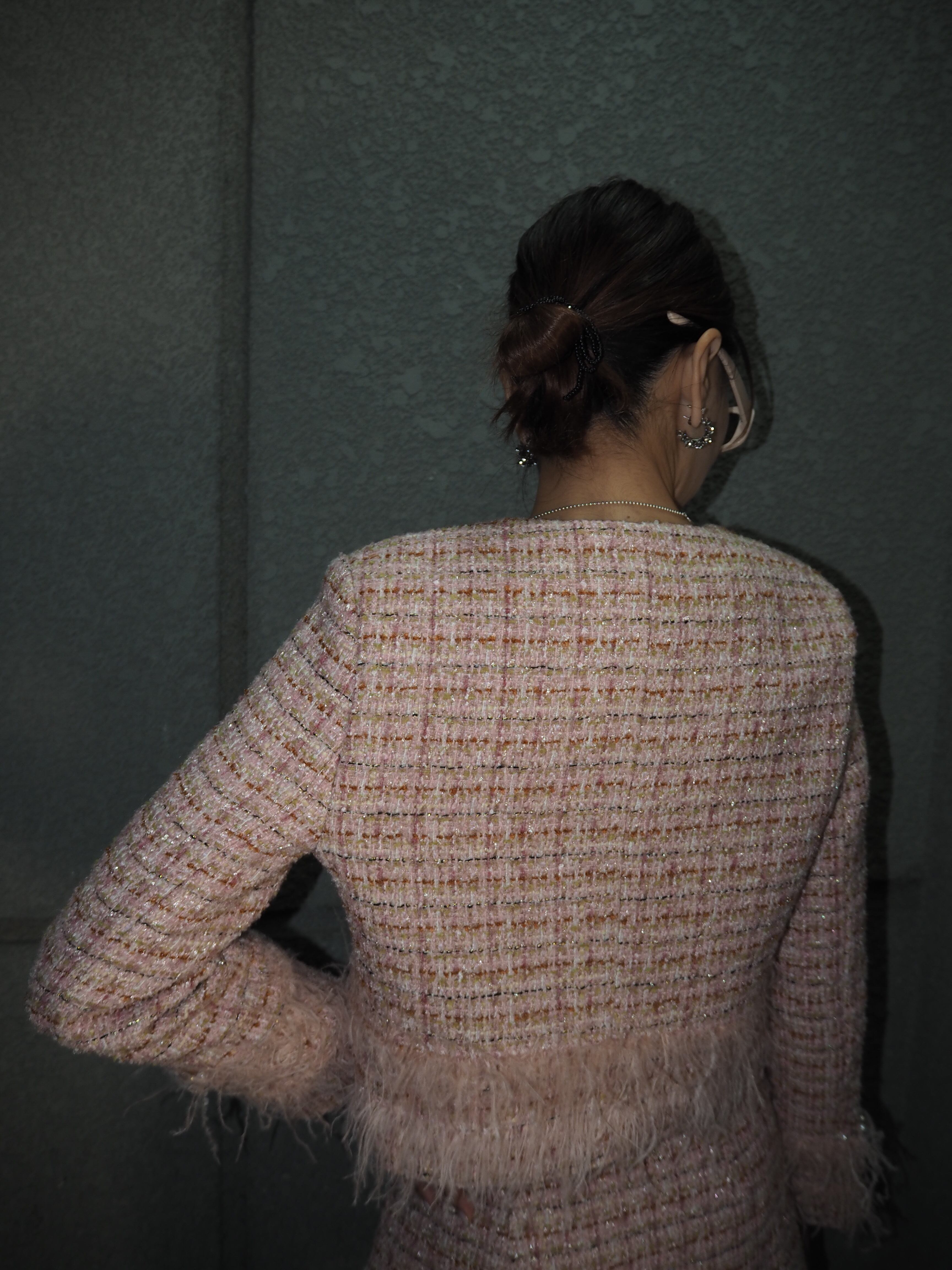 fancy tweed fringe trimming jacket × mini skirt 2P set up セットアップ 2点セット ジャケット スカート ミニスカート ピンク フェザー 春