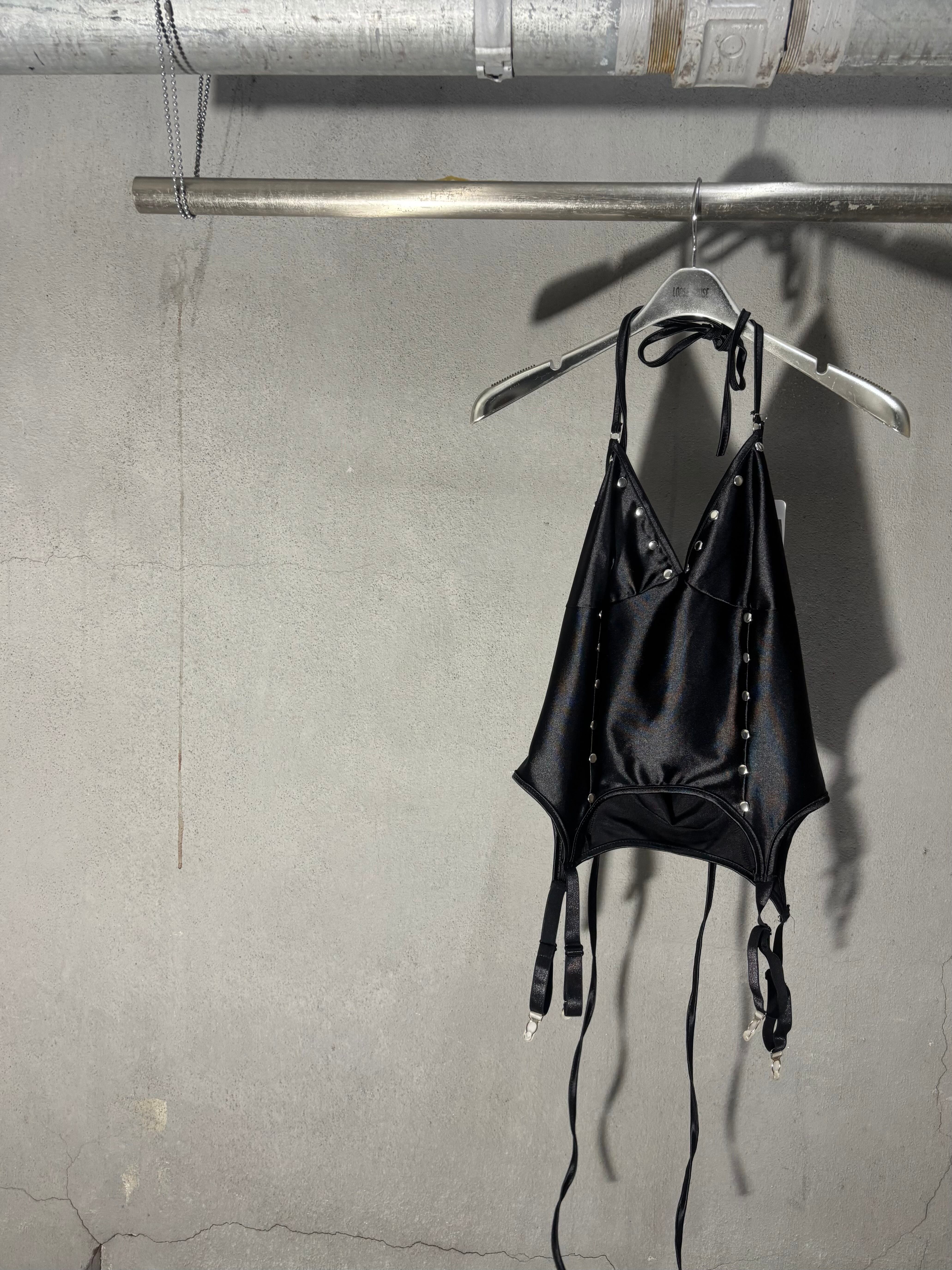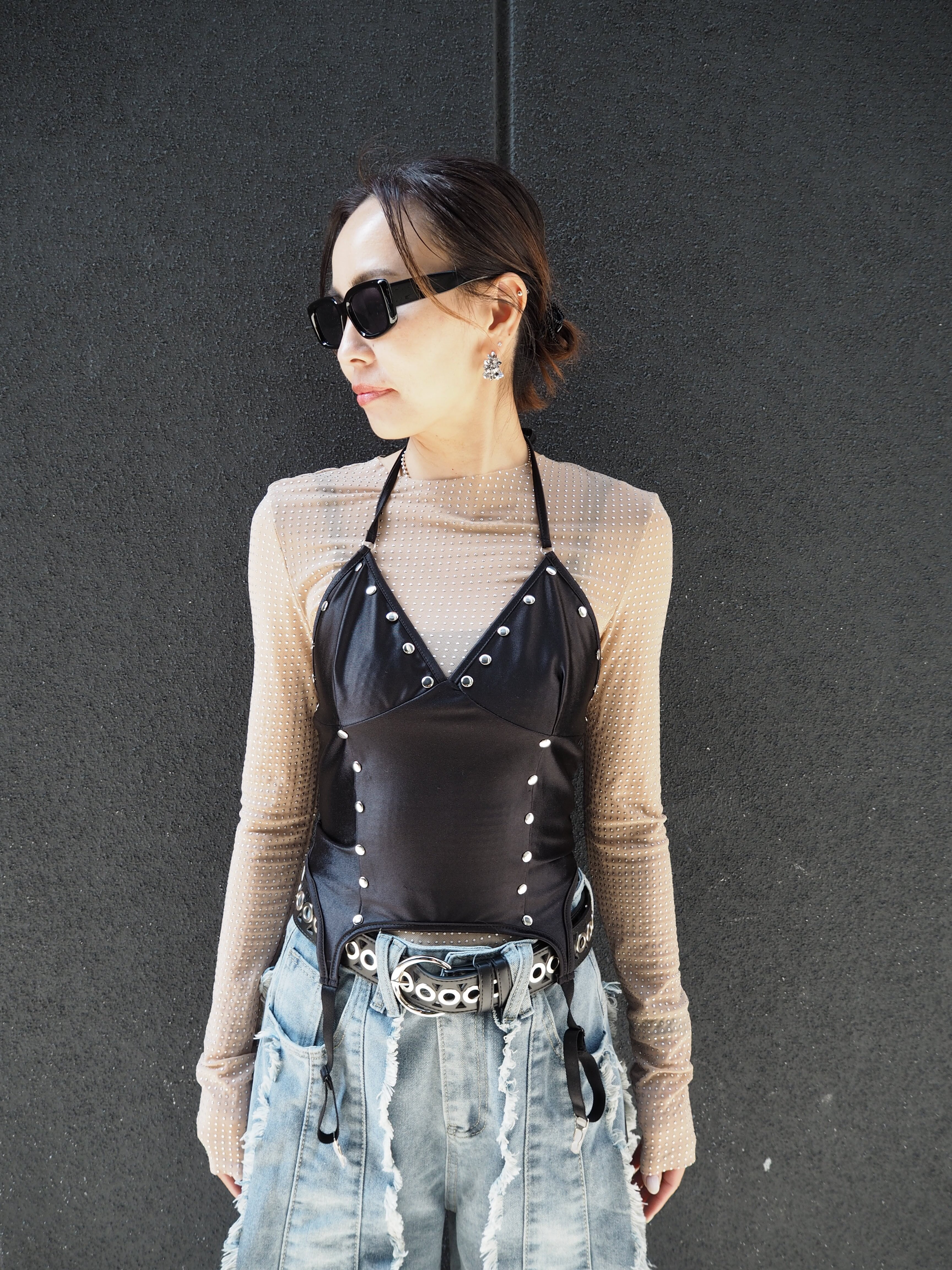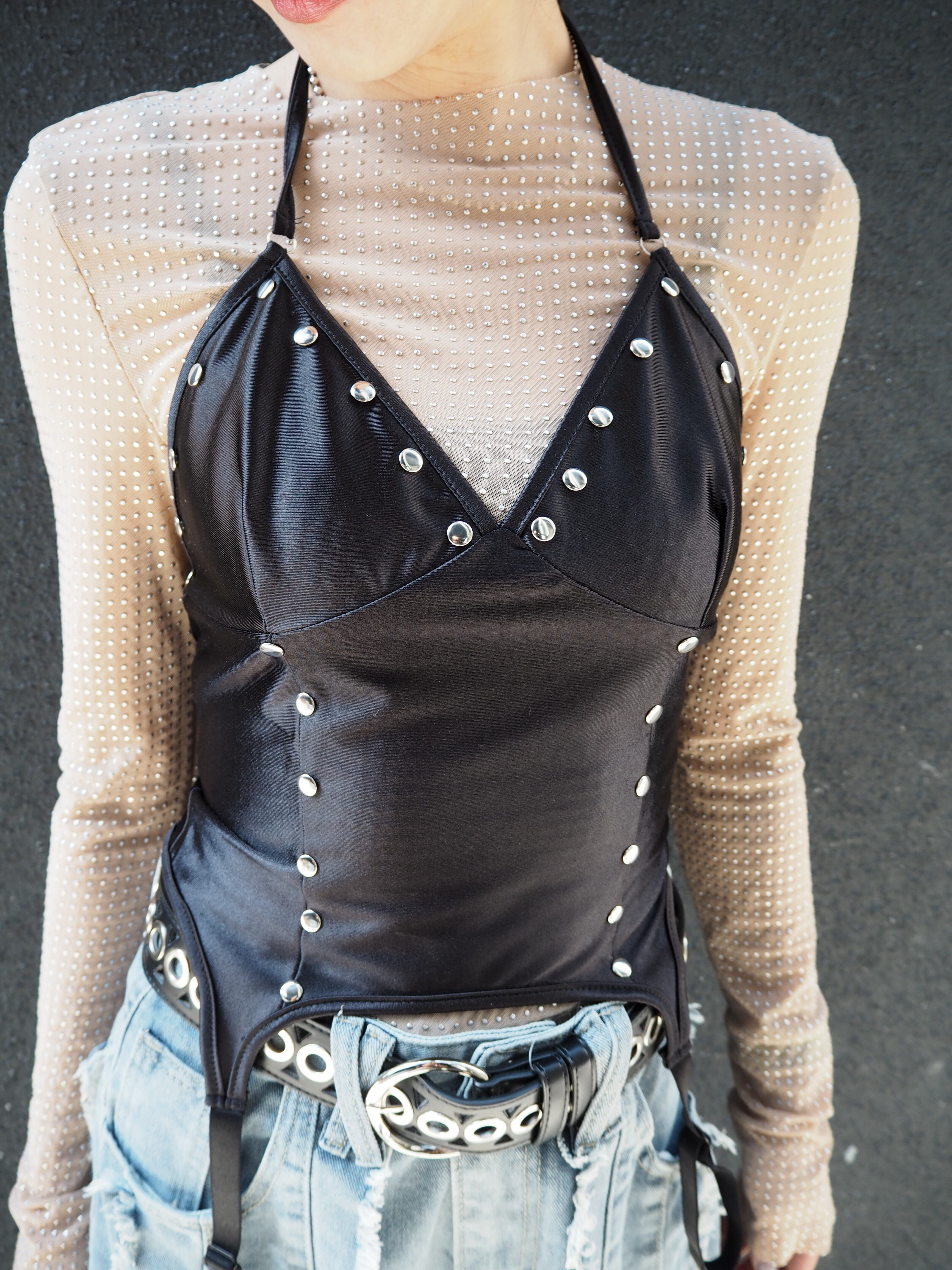 silver studs holder neck design camisole キャミソール キャミ スタッズ シルバー ホルターネック 黒 ブラック 重ね着 レイヤード